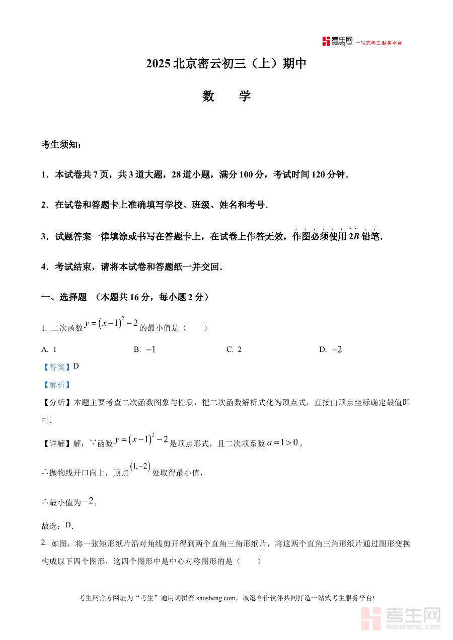 《精品解析:北京市密云区2025--2026学年九年级上学期期中数学试卷(解析版)》是面向北京市密云区2025至2026学年九年级学生的期中数学考试配套解析资料。它依托本地区该学年九年级上学期期中数学检测的具体背景,为使用者提供与考试紧密关联的解析内容,助力把握考试的核心方向与要求。