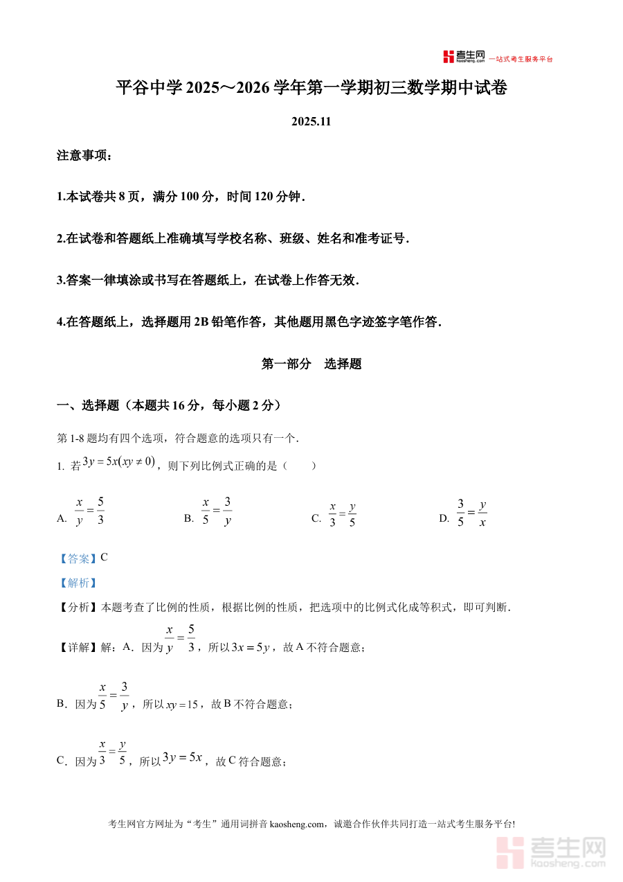 该资料主要适用于北京市平谷中学2025-2026学年上学期的九年级学生,也可作为数学教师进行期中复习指导的参考工具,其解析内容有助于学生巩固阶段所学知识,强化对期中考点的理解,对提升期中测试成绩及后续学习规划具有重要实用价值。