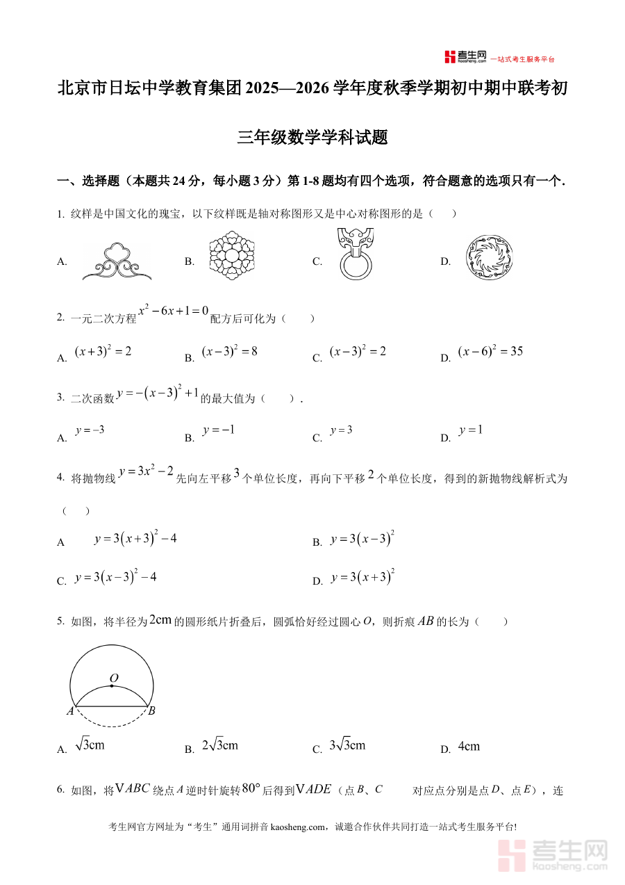 《精品解析:北京市日坛中学教育集团2025-2026学年上学期 期中联考九年级数学试题(原卷版)》是针对北京市日坛中学教育集团在2025-2026学年上学期组织的九年级数学期中联考所编制的原卷版备考资料。该资料紧密贴合集团联考的考试安排与学科要求,为使用者提供了与实际考试形式一致的试题载体,有助于提前感知考试的整体结构与考查范围,是备考该次期中联考的重要参考材料。