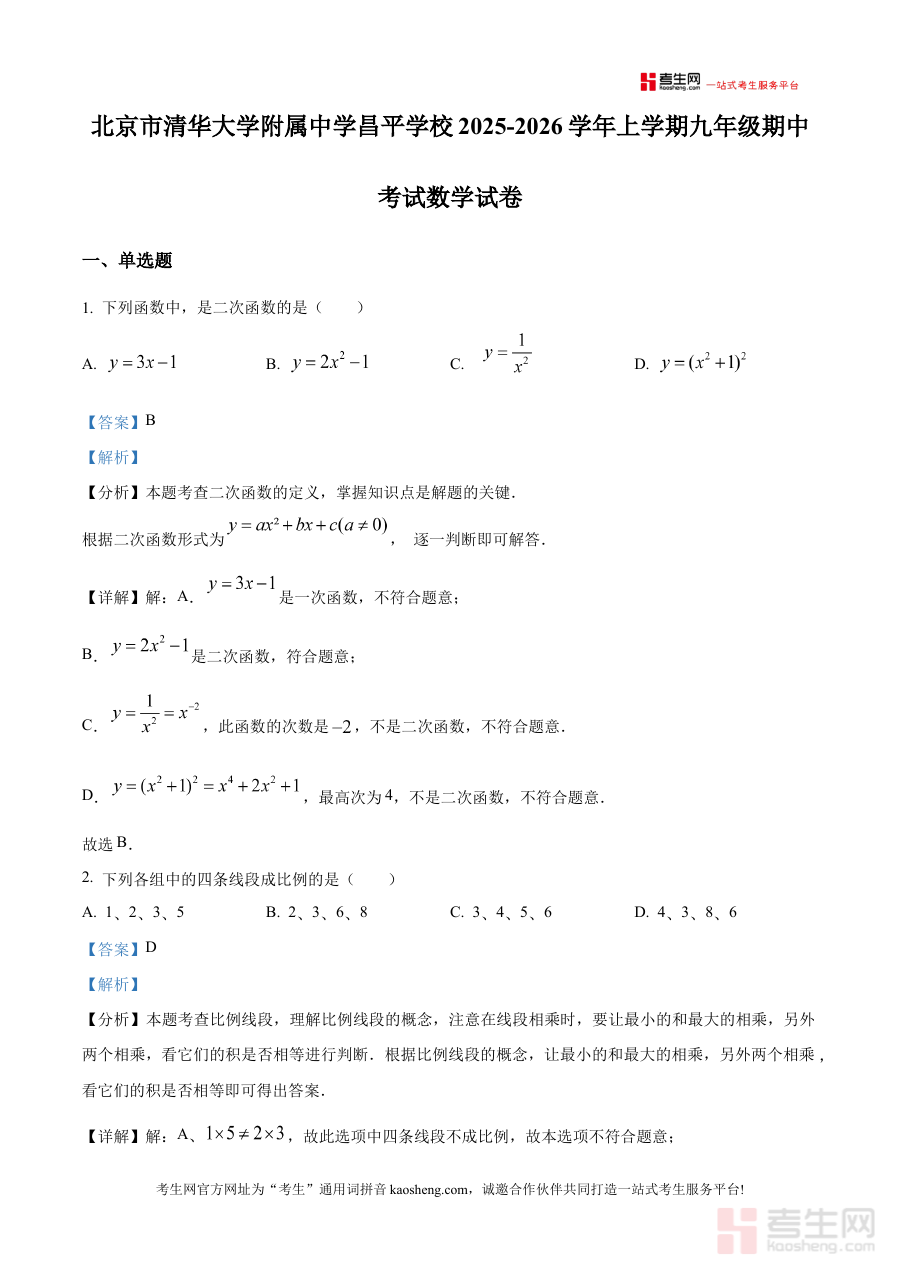 本资料适用于北京市清华大学附属中学昌平学校2025-2026学年上学期九年级学生及数学教师,对学生而言,能借助解析深化知识点理解与应用能力;对教师而言,可辅助优化教学方案,增强阶段检测的指导价值与备考规划的精准度。
