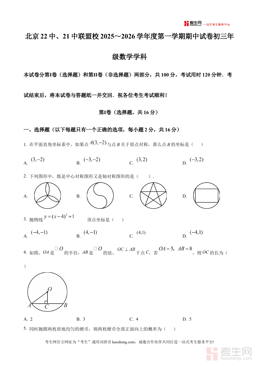 《精品解析:北京市第二十一中学、第二十二校2025-2026学年九年级上学期期中数学试卷(原卷版)》是针对北京市第二十一中学与第二十二校联合开展的2025-2026学年九年级上学期期中数学考试的配套备考资料,聚焦该阶段数学学科的期中检测场景,为师生提供贴合校考实际的原始试卷资源。