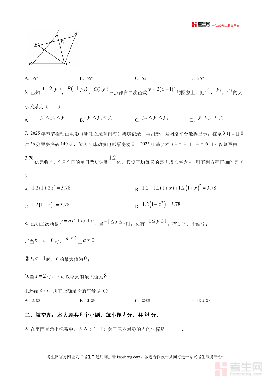 该资料可支持九年级学生开展期中前的自我评估,辅助教师诊断学生阶段性数学学习状况,也为家长了解孩子学习进展提供依据,帮助使用者通过原卷形式把握考试方向与核心考查点,提升备考的针对性与有效性。