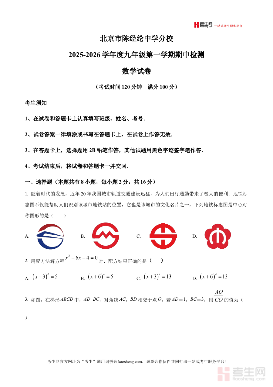 《精品解析:北京市陈经纶中学分校2025--2026学年九年级上学期期中数学试卷(原卷版)》是针对北京市陈经纶中学分校2025-2026学年九年级学生设计的期中数学考试配套资料,聚焦该学年上学期中期阶段的数学学科检测需求,为相关备考活动提供直接参考依据。