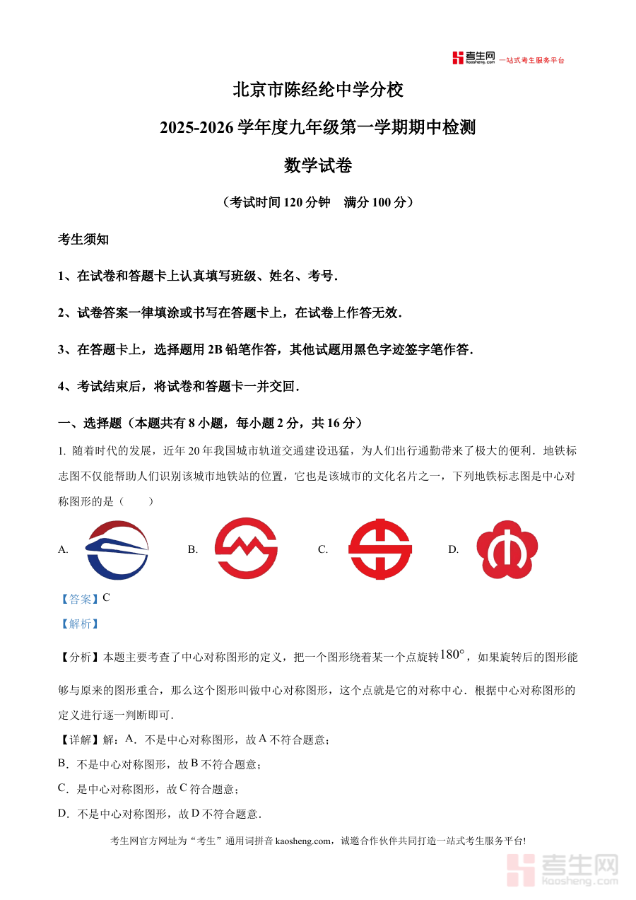 《精品解析:北京市陈经纶中学分校2025--2026学年九年级上学期期中数学试卷(解析版)》是针对北京市陈经纶中学分校2025至2026学年九年级上学期期中数学考试的专项备考资料,紧密贴合该校该学年九年级数学学科的教学进度与期中检测要求。作为带有解析内容的资料,它不仅涵盖了期中试卷的核心考查框架,还通过详细的解析过程为使用者提供清晰的思路引导,是适配该学校九年级学生期中复习阶段需求的针对性学习资源。