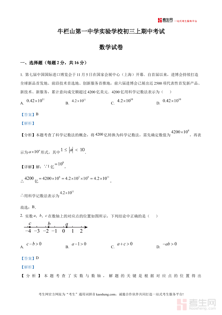 《精品解析:北京市顺义牛栏山第一中学实验学校2025--2026学年上学期期中考试数学试卷(解析版)》是针对北京市顺义区牛栏山第一中学实验学校特定学年上学期数学期中考试的配套解析类备考资料。该资料聚焦于2025至2026学年第一学期的期中阶段数学考试需求,依托学校自身的教学进度与考试标准,为相关使用者提供与该校考试直接匹配的解析内容支撑。