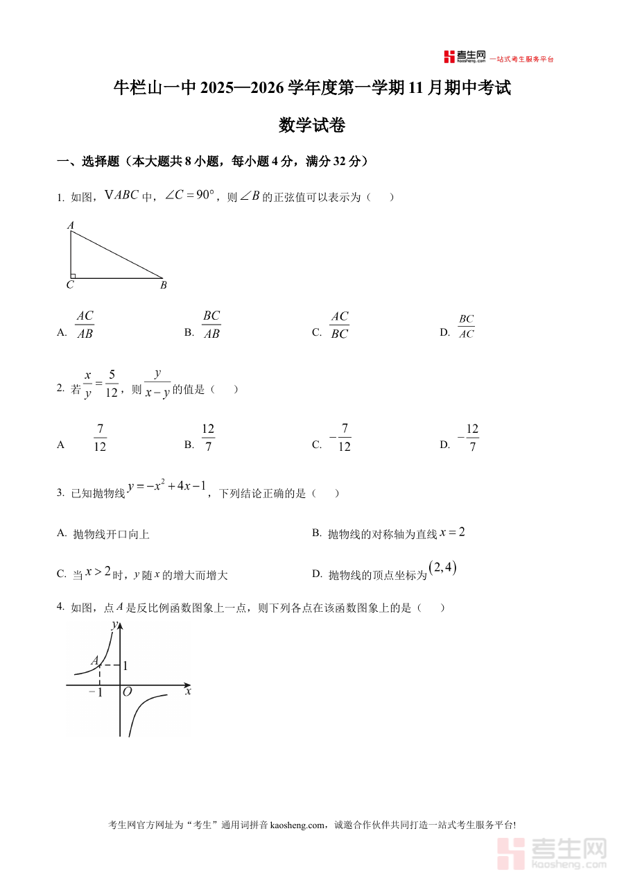《精品解析:北京牛栏山一中2025-2026学年上学期九年级期中数学试题(原卷版)》是针对北京牛栏山一中特定学年学期的九年级期中数学考试原卷资料,精准对应该校九年级学生上学期期中阶段的数学检测需求,依托学校教学实际与期中检测标准编制,原卷版形式保证了与实际考试的高度一致性,为相关备考活动提供了契合度高的参考载体。