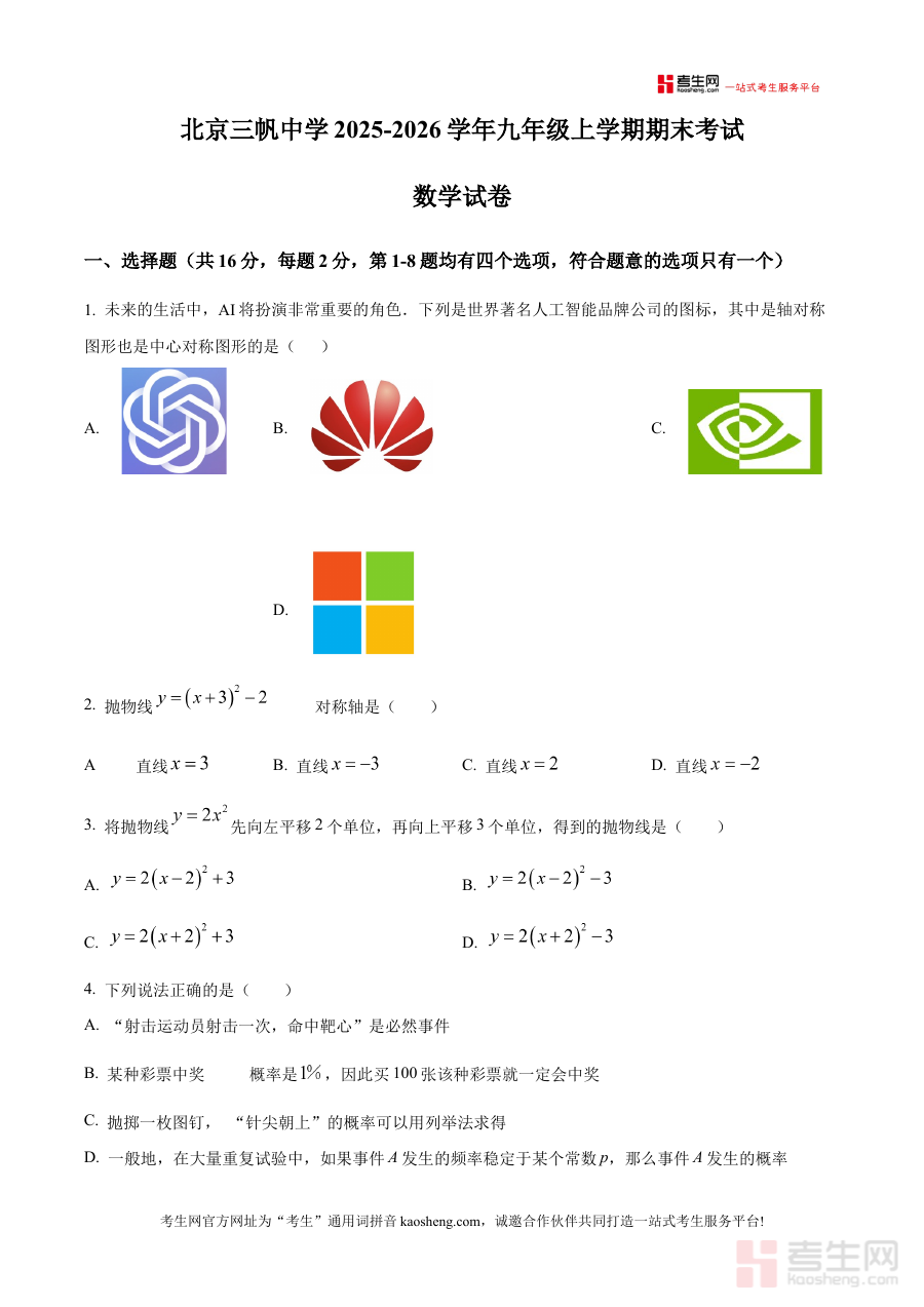 《精品解析:北京三帆中学2025-2026学年九年级上学期期末考试数学试卷(原卷版)》是针对北京地区三帆中学2025至2026学年九年级上学期数学期末考试打造的备考资料,精准对应该学年该阶段的教学进度与考试标准,为学生提供贴合实际考试场景的练习资源。
