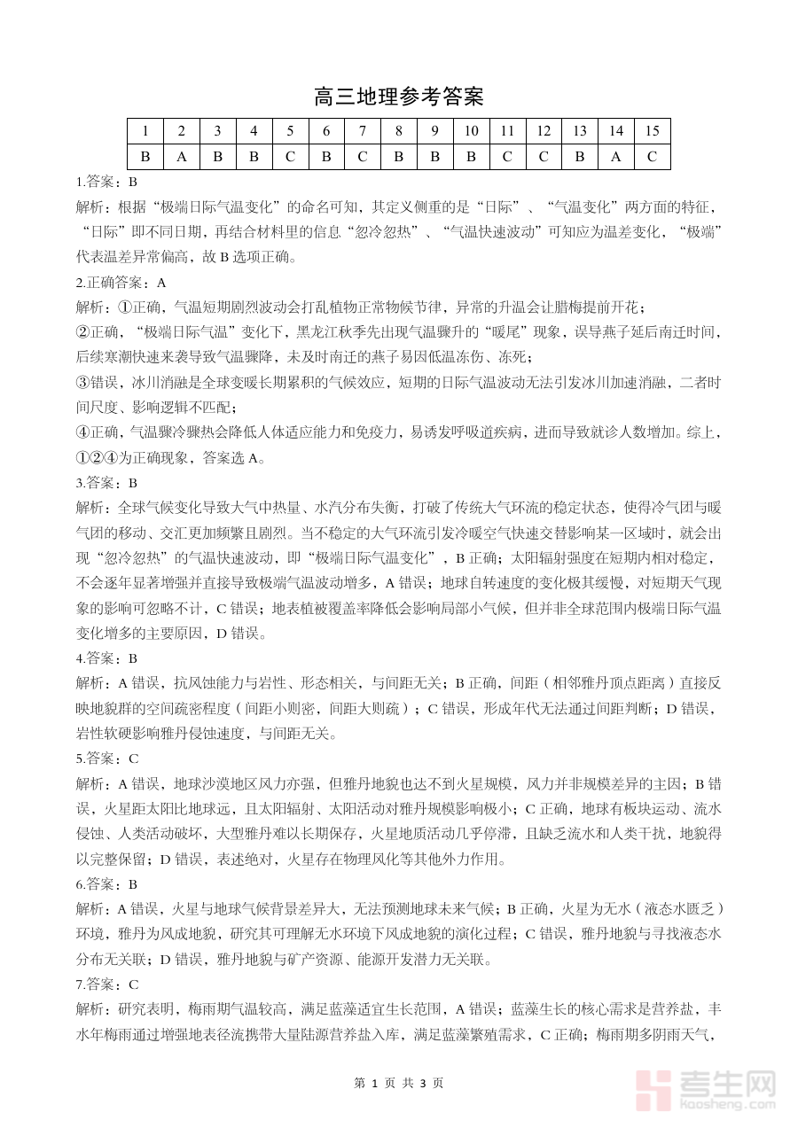 该资料可辅助高三学生核对开学考试地理科目的答题结果,帮助教师完成对学生开学初期地理学习状态的诊断评估,同时为后续教学计划调整及备考策略优化提供数据支撑,助力师生明确阶段学习重点与改进方向。