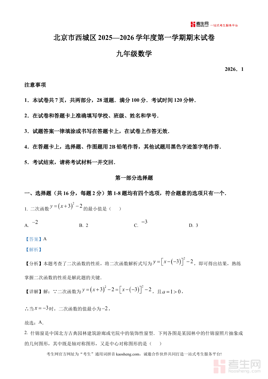 《精品解析:北京市西城区2025-2026学年九年级上学期期末数学试卷(解析版)》是针对北京市西城区2025至2026学年九年级上学期期末数学考试的专项备考资料,精准对应该地区该学年九年级学生的期末数学检测需求,为学生提供贴合本地教学进度与考试方向的复习支持。