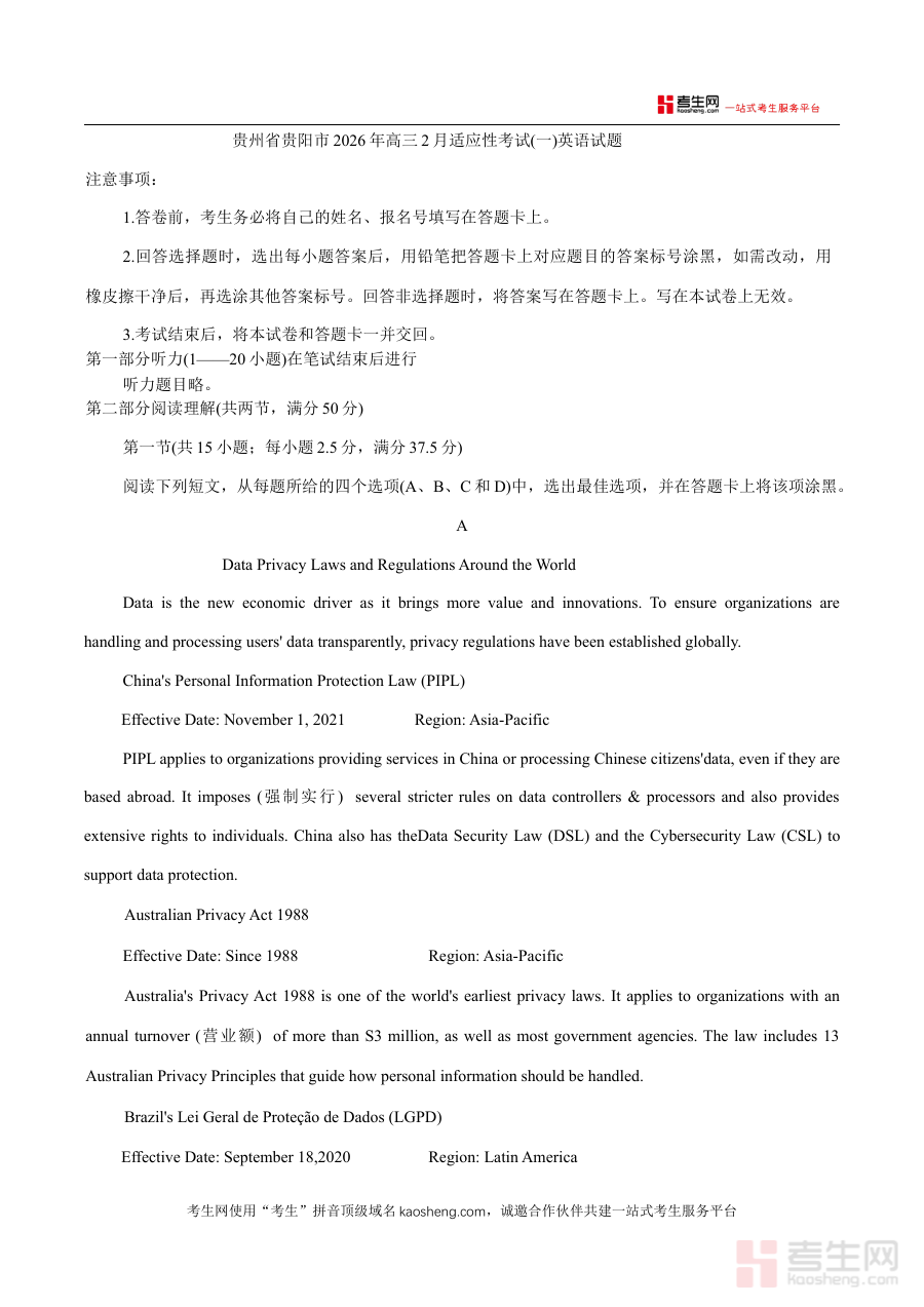 《贵州省贵阳市2026年高三年级2月适应性考试(一)(贵阳一模)英语试题(含答案)》是贵州省贵阳市针对2026届高三学生组织的首场适应性考试(即贵阳一模)的英语学科配套资料,包含试题与答案两部分内容,属于高三复习阶段重要的阶段性备考资源。该考试作为当地高三复习进程中的关键节点,其试题及答案的组合为考生提供了贴合本地命题趋势的完整备考参考依据,有助于考生提前熟悉考试形式、节奏及本地命题特点,为后续的系统复习奠定基础。