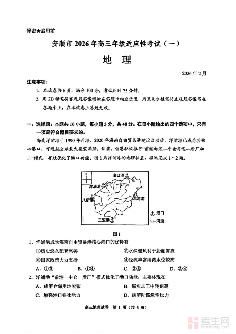 《贵州省贵阳市2026年高三年级2月适应性考试(一)(贵阳一模)地理试卷》是贵州省贵阳市针对2026届高三学生组织的阶段性适应性考试的地理学科试卷,属于当地高三备考进程中的重要资料。该考试作为贵阳传统的“一模”考试组成部分,贴合高考备考关键阶段的需求,为学生提供与本地高考命题趋势接轨的练习载体,帮助学生提前适应正式考试的节奏与要求。