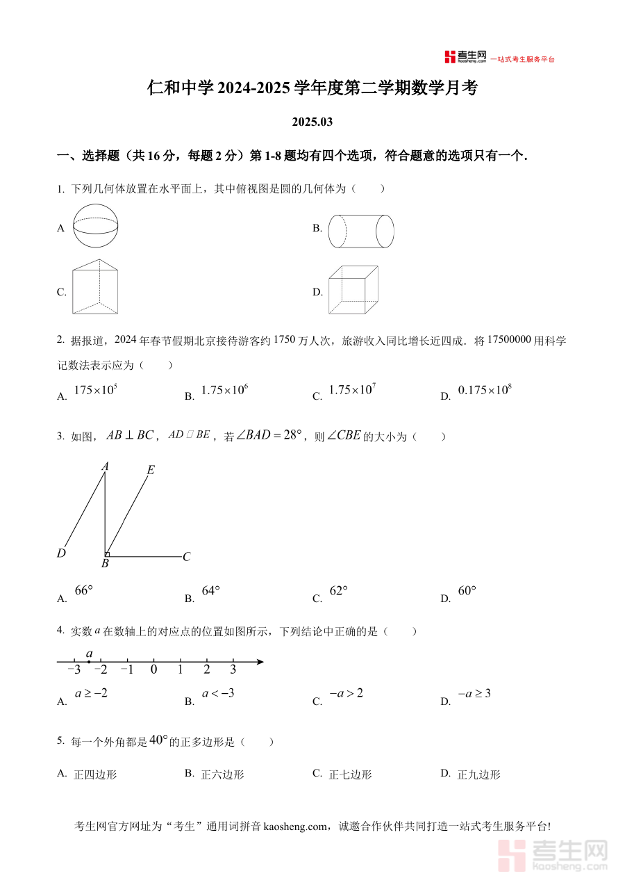 《精品解析:北京市顺义区仁和中学2024-2025学年九年级下学期3月月考数学试题(原卷版)》是针对北京市顺义区仁和中学2024-2025学年九年级下学期3月数学月考设计的配套备考资料,紧密贴合该校该阶段的数学教学进度与考试要求,为师生提供与校考实际高度匹配的参考内容。