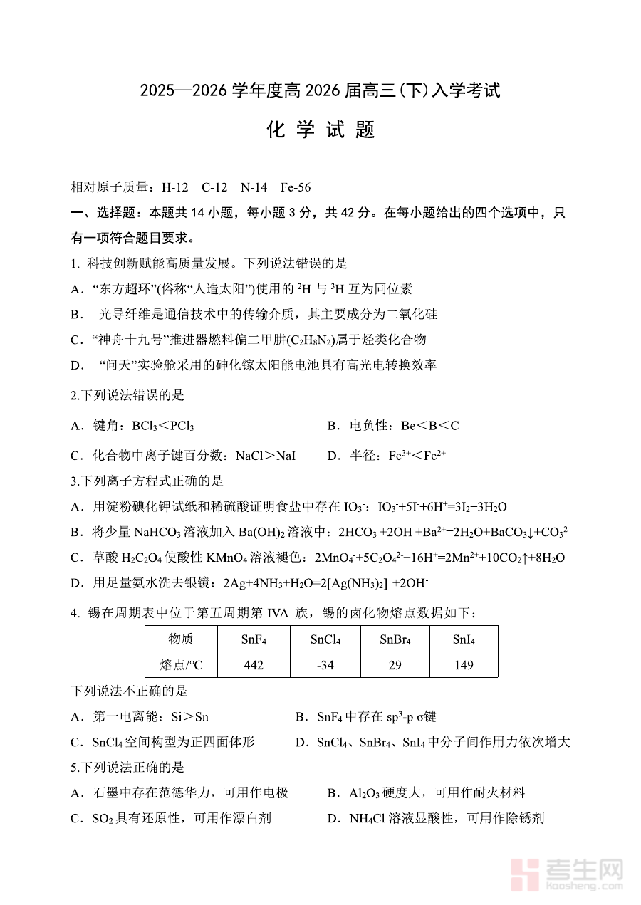 《重庆市第八中学校2025-2026学年度(下)高三年级入学考试 化学》是针对2025-2026学年度下学期重庆市第八中学校高三年级学生入学阶段的化学学科考试资料,属于高中阶段重要的阶段性考试备考资源,能够反映该阶段学生化学学科的学习状态与知识储备情况。