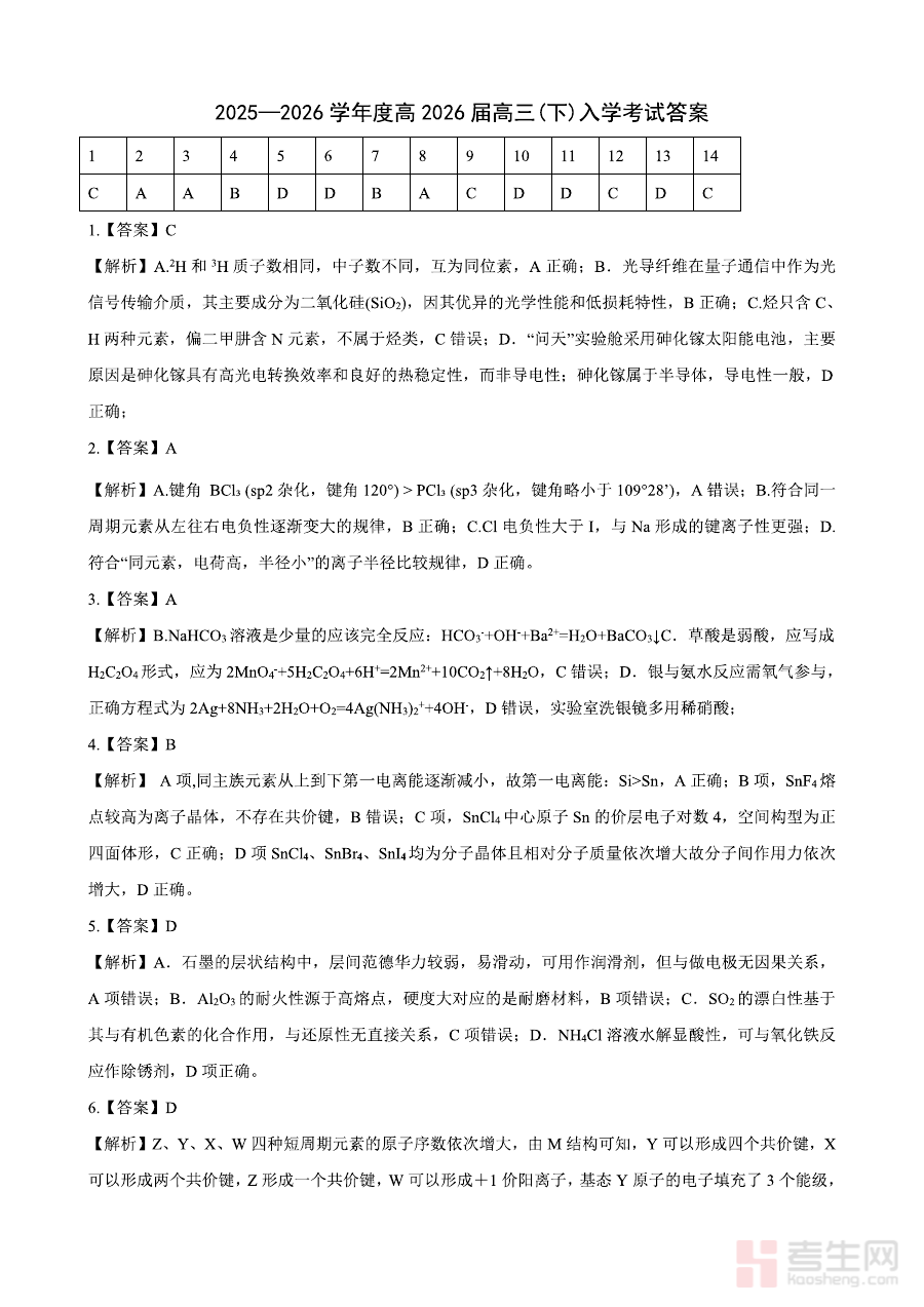 该资料可用于高三学生核对入学考试化学科目的作答结果,帮助师生快速掌握阶段学习成效,及时发现知识掌握中的问题与不足,为后续复习计划的调整和优化提供数据支撑,助力教学与备考工作的精准开展。