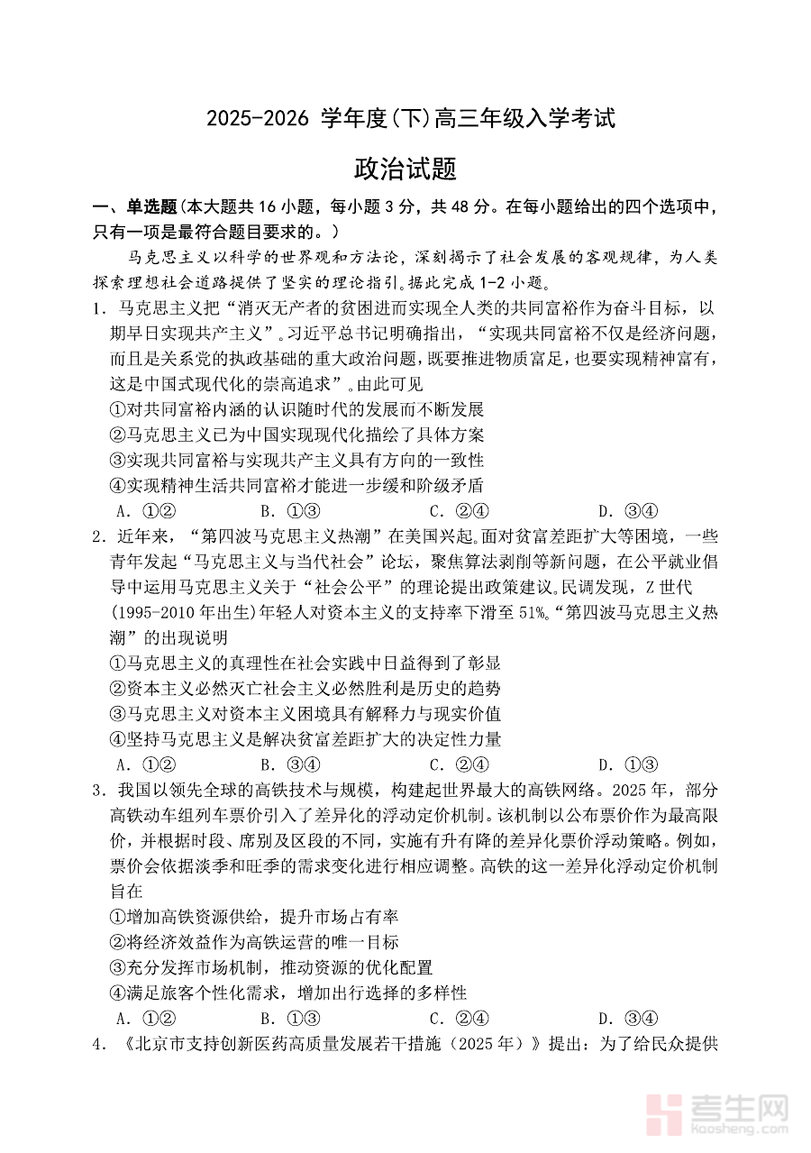 《重庆市第八中学校2025-2026学年度(下)高三年级入学考试 政治》是针对重庆市第八中学校2025至2026学年下学期高三年级入学阶段的政治学科考试资料,属于区域性中学阶段的阶段性考试备考资料,贴合该学校高三年级学生在新学期入学时的政治学科学习场景与考试需求。