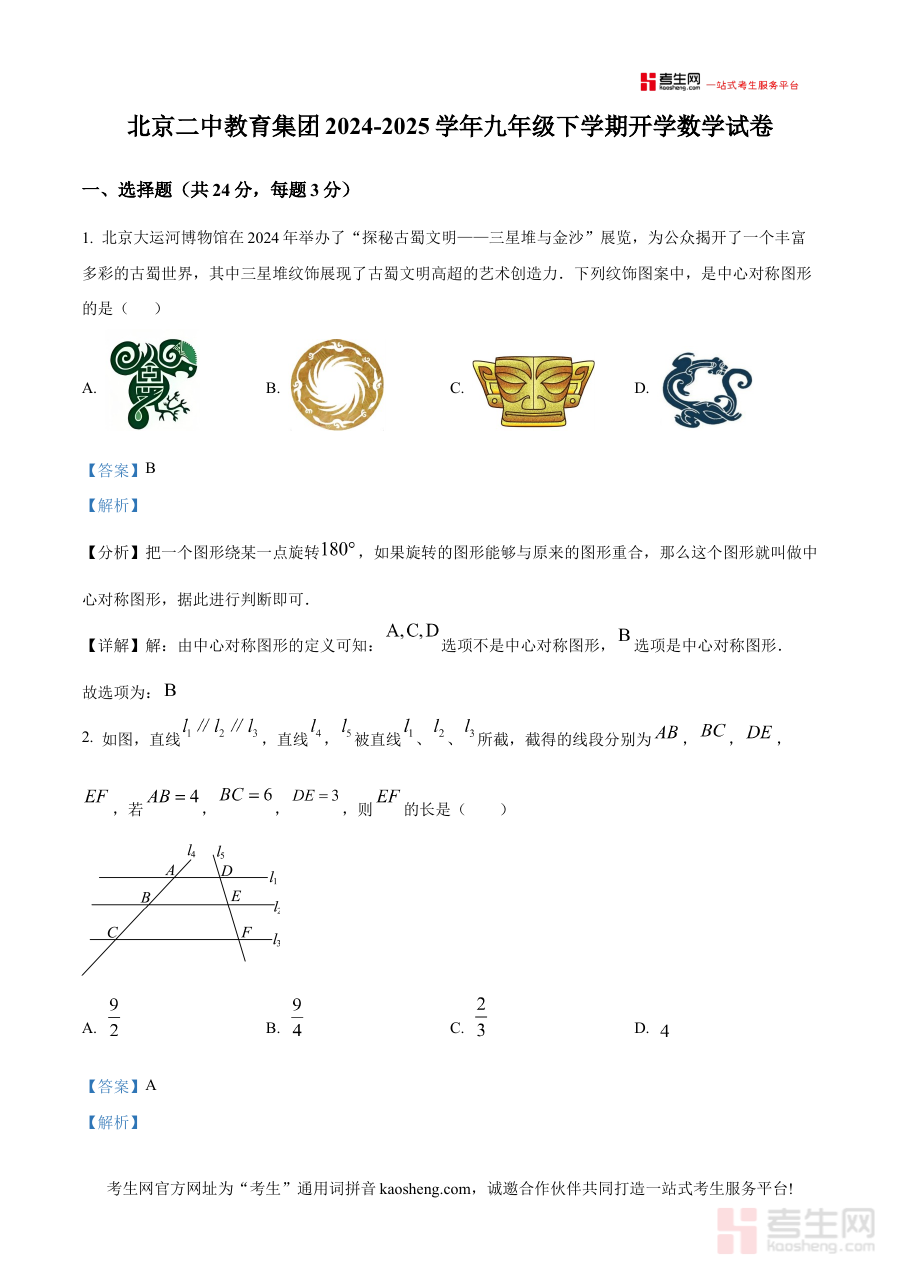 《精品解析:北京二中教育集团2024-2025学年九年级下学期开学数学试卷(解析版)》是针对北京地区北京二中教育集团内2024-2025学年九年级下学期开学阶段的数学考试编写的备考资料,聚焦该阶段学生的数学学习情况与开学检测需求,为相关教学与备考提供针对性支持。
