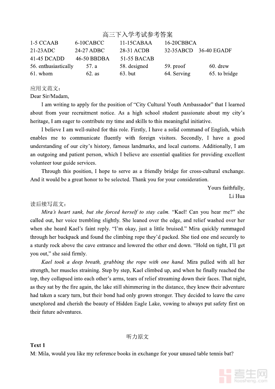 《重庆市第八中学校2025-2026学年度(下)高三年级入学考试 英语答案》是重庆市第八中学校在2025至2026学年度第二学期针对高三年级入学考试编制的英语科目官方参考答案资料。该资料与本次高三入学考试的英语试题直接对应,作为考试配套的重要组成部分,能够为使用者提供权威、准确的作答参考依据,帮助其了解考试的评分标准和答题规范方向。