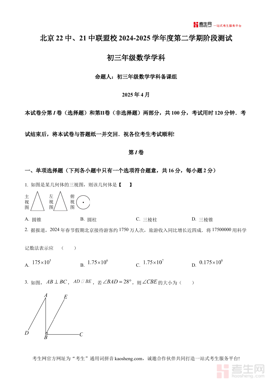 《精品解析:北京市东城区21中.22中联盟校2024~2025学年九年级下 数学4月月考试题(原卷版)》是北京市东城区21中与22中联盟校在2024至2025学年九年级下学期推出的数学学科4月份月考试卷原卷资料。该资料紧密结合两校联盟的教学进度与阶段性考查目标,精准匹配九年级下学期数学学科的关键备考节点,为使用者提供与校际联盟同步的高质量备考素材,助力其把握当前阶段数学学习的核心方向。