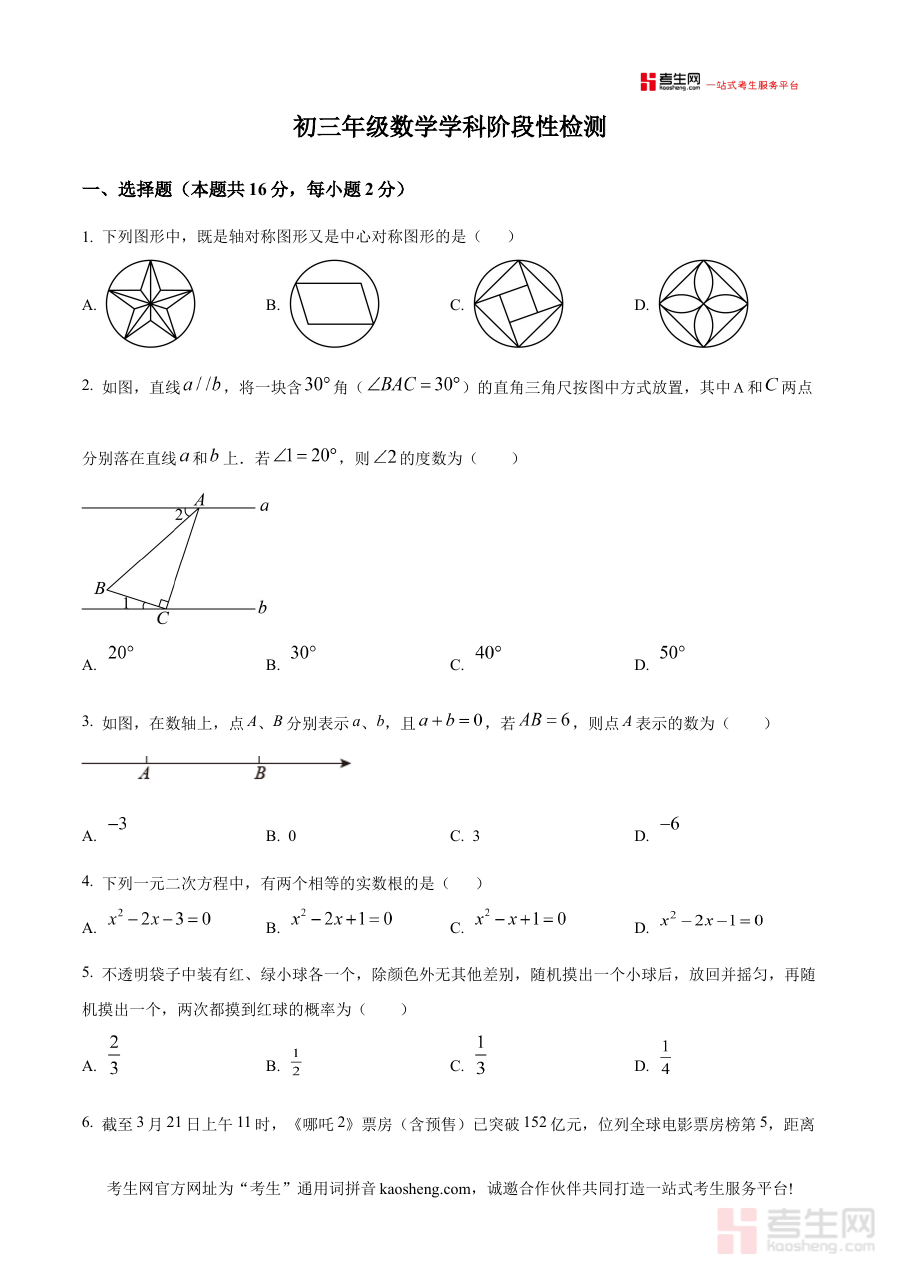 这份资料作为原卷版考试资料,主要用于九年级学生进行阶段学习效果的自我检测与学情诊断,帮助学生及时发现自身在数学学习中的薄弱环节,同时也为教师提供了解学生阶段性学习情况的工具,辅助教师调整后续教学计划与备考指导方向,助力师生明确下一阶段的学习重点与备考规划。