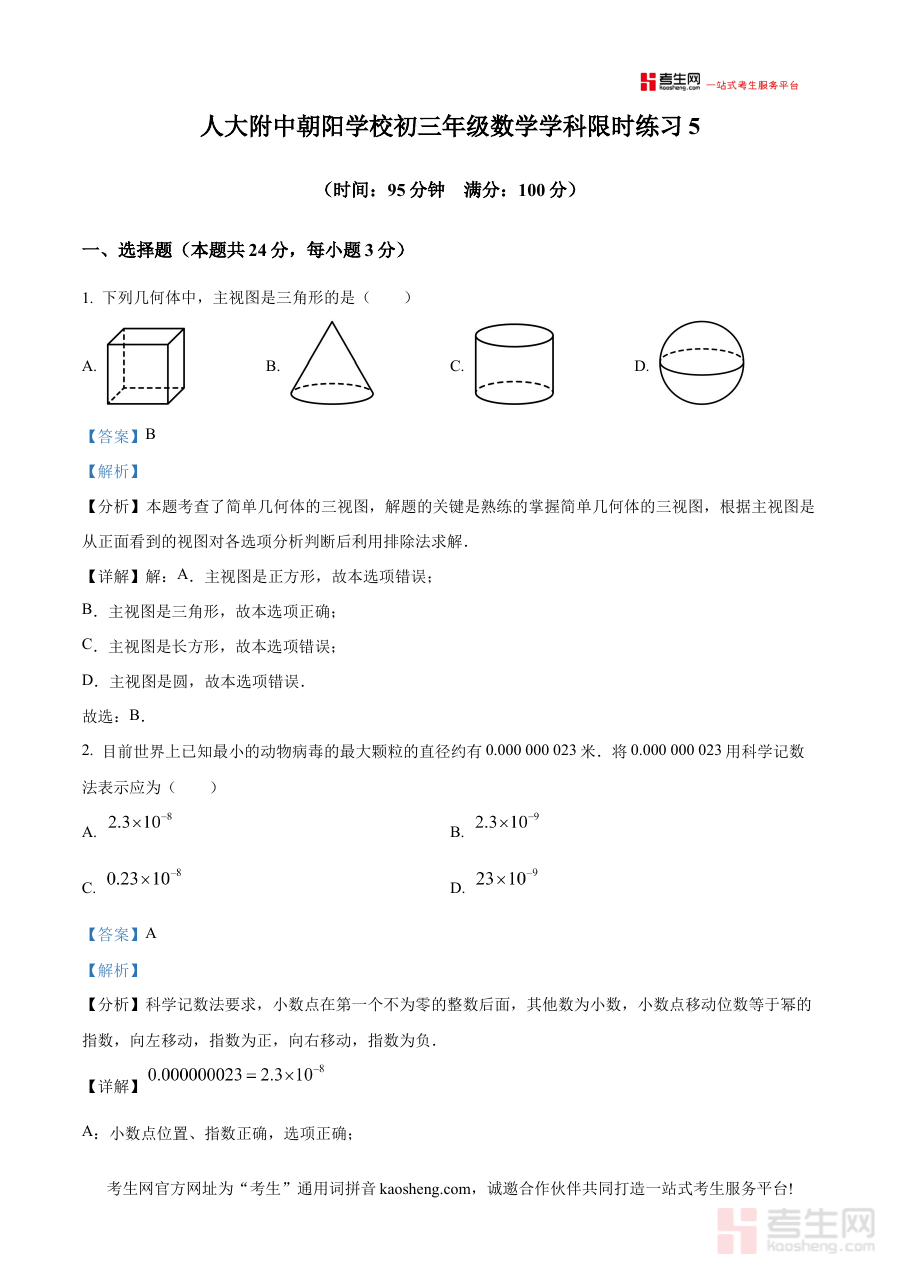 《精品解析:北京市中国人民大学附属中学朝阳学校2024--2025学年下学期九年级数学统练5(解析版)》是针对北京市中国人民大学附属中学朝阳学校2024至2025学年下学期九年级数学学科第五次统练的专项解析资料。该资料紧密贴合该校该学年下学期九年级数学的教学进度与阶段性考查方向,聚焦统练中涉及的数学知识模块与能力要求,为学生提供全面且详细的解析支持,是适配该校九年级学生阶段性数学学习与备考需求的优质辅助材料。