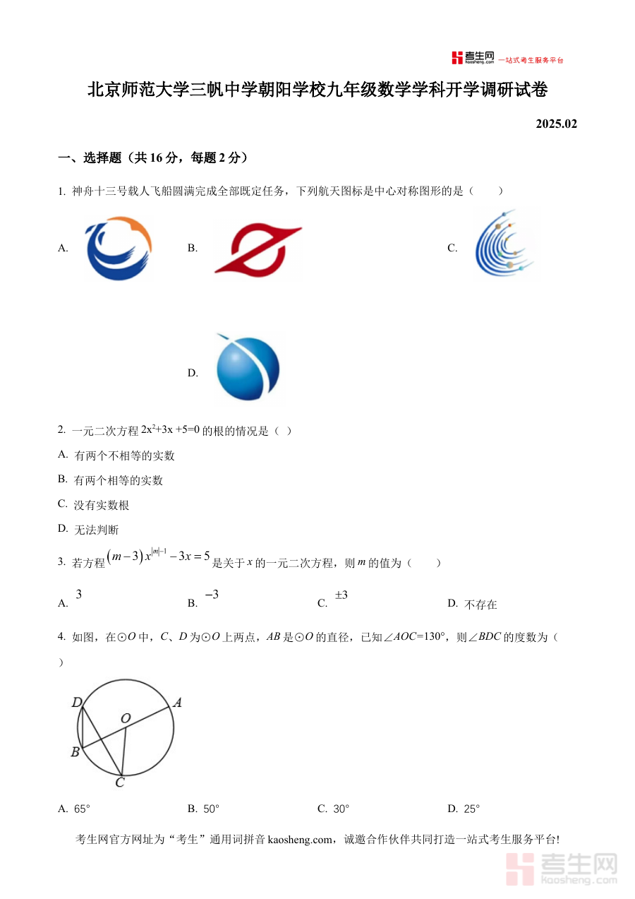 《精品解析:北京市北京师范大学三帆中学朝阳学校2024~2025学年九年级下学期开学测试数学试卷(原卷版)》是针对北京市北京师范大学三帆中学朝阳学校2024至2025学年九年级下学期开学阶段数学测试的专用备考资料,聚焦该学期开学初期的数学学科检测场景,为相关师生提供与学校实际测试直接匹配的原卷资源。