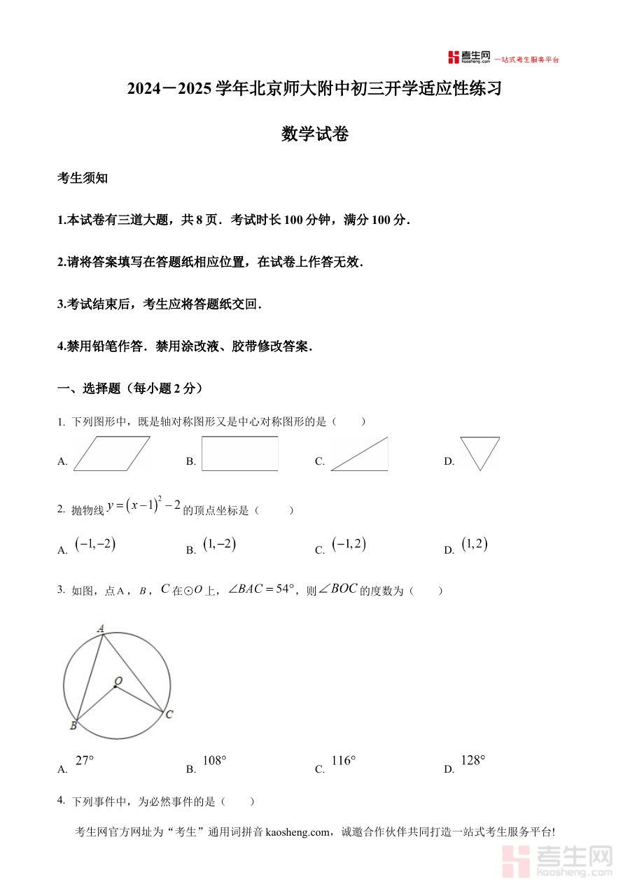 本资料适用于北京市北京师范大学附属中学九年级学生,通过使用该原卷版试卷进行练习,学生能够熟悉开学考试的形式与要求,有效检验假期学习成果,为新学期数学学习及中考备考奠定基础,提升阶段学习的有效性与针对性。