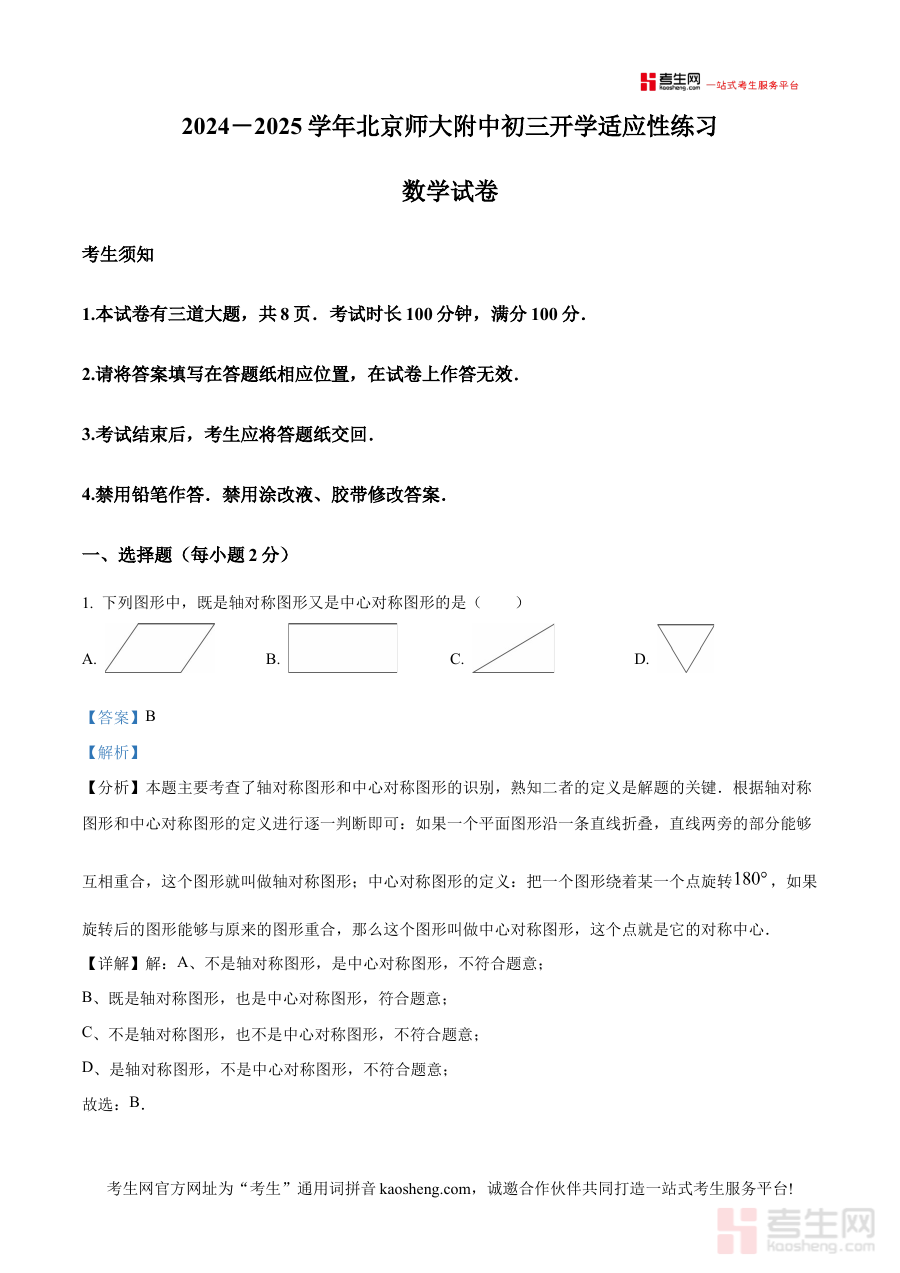 该资料的适用人群主要包括北京市北京师范大学附属中学的九年级学生、该校数学教师以及关注该校考试动态的教育工作者。对于学生而言,它是开学考试前进行自我检测与备考复习的重要工具;对于教师而言,它可作为学情分析与教学调整的参考依据;对于其他相关教育工作者而言,它也能提供关于同类学校开学考试设计与备考策略的借鉴价值,助力提升教育教学与备考指导的科学性。