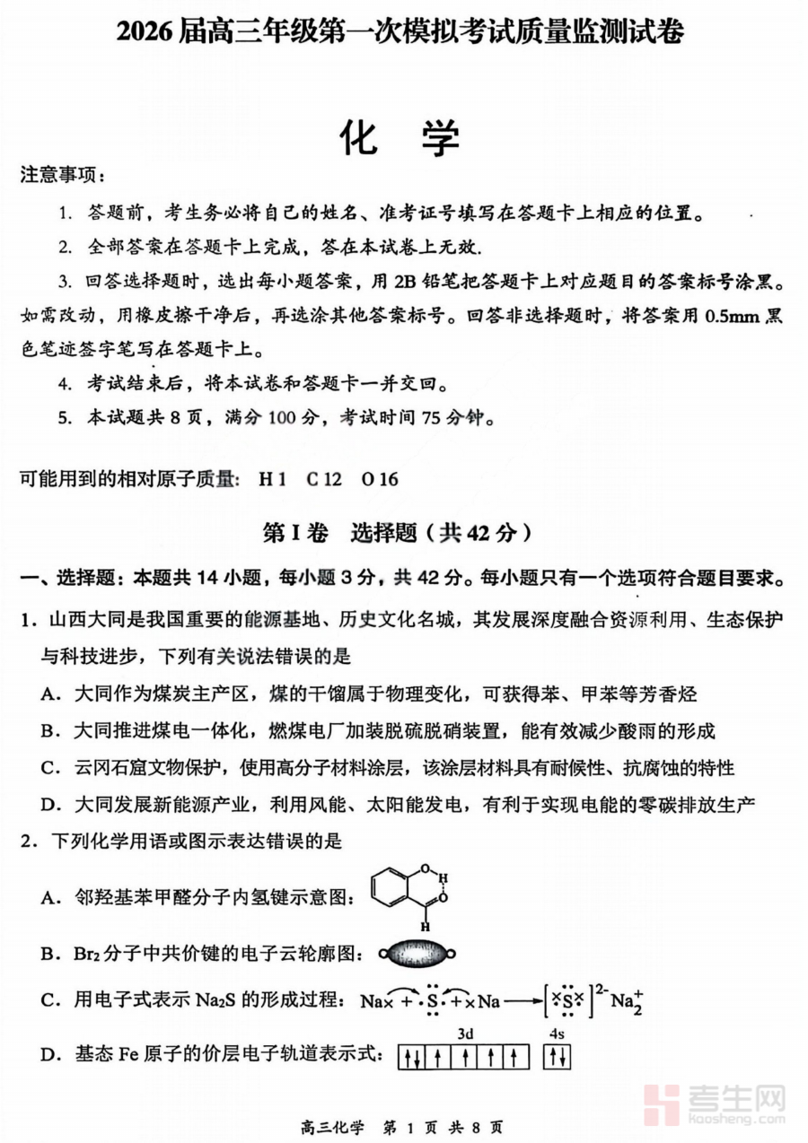 《2026届高三年级第一次模拟考试质量监测试卷 化学》是面向2026届高三学生推出的化学学科阶段性模拟考试资料,属于高三年级首次模拟考试类别的质量监测试卷。该试卷聚焦高三化学学习初期的知识巩固与能力检测需求,是对学生进入高三以来化学知识体系构建情况、学科核心素养发展水平进行初次系统性评估的重要工具,能够为后续备考工作提供基础的数据参考和方向指引。