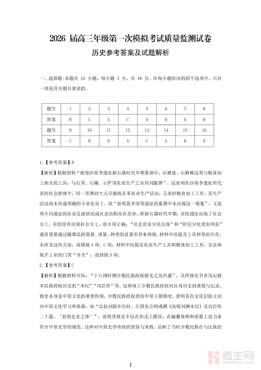 《2026届高三年级第一次模拟考试质量监测试卷 历史答案》是针对2026届高三学生历史学科的第一次模拟考试质量监测配套资料,属于高三阶段重要的备考资源之一。该资料对应高三年级首次模拟考试的历史试卷,旨在为师生提供权威准确的参考答案,辅助完成对本次模拟考试的评估与分析工作,是衔接高三初期复习与后续备考规划的关键参考材料。