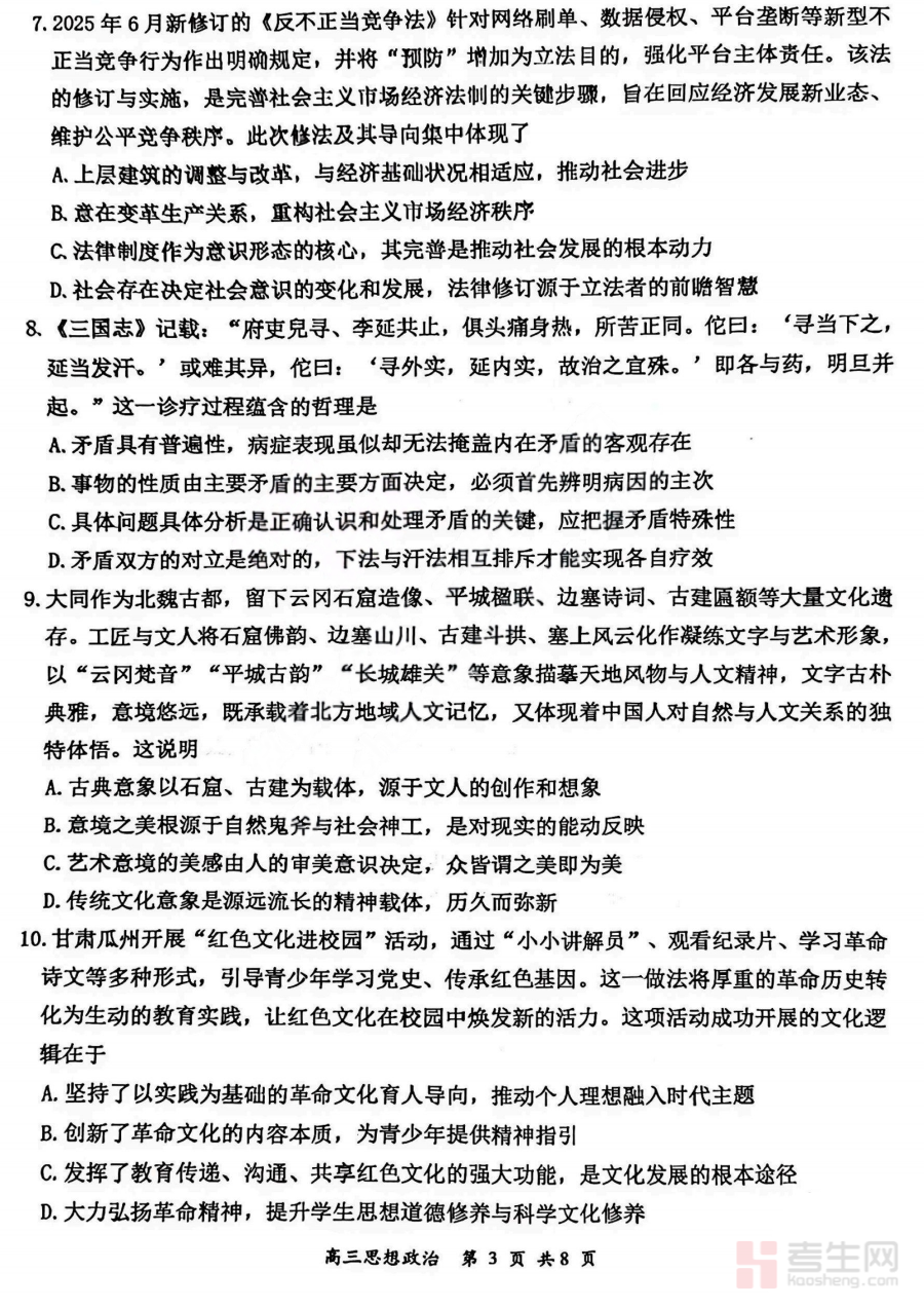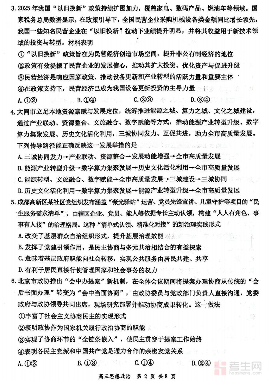 该试卷适用于2026届高三年级的学生、政治学科教师及相关教学管理者。对于学生而言,它是高三备考初期进行自我评估和定位的重要工具,能够帮助学生快速适应模拟考试的形式与节奏,提升应试能力;对于教师而言,它是开展针对性教学和个性化辅导的重要依据,有助于精准把握学生的学习痛点;对于教学管理者而言,它能够为整体教学质量监控和备考规划制定提供客观的数据支撑,确保高三政治学科备考工作的科学性与有效性。