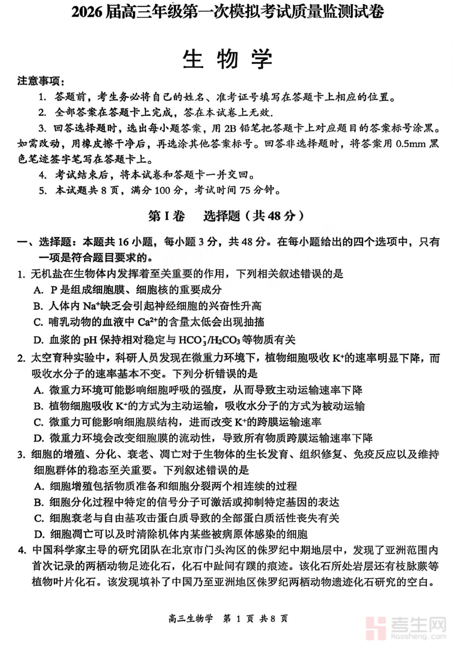 《2026届高三年级第一次模拟考试质量监测试卷 生物》是针对2026届高三学生生物学科的阶段性模拟检测资料,属于高三备考初期的质量监测工具。该试卷聚焦高三生物学科初始阶段的学习成果呈现,通过标准化模拟考试形式为师生提供反映当前学习状况的客观依据,是高三生物备考体系中重要的阶段性参考资料。