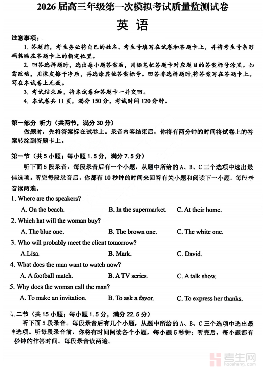 《2026届高三年级第一次模拟考试质量监测试卷 英语》是针对2026届高三学生设计的英语学科模拟考试资料,属于高三备考初期的质量监测试卷类型。该试卷贴合2026届高三学生的备考阶段特点,旨在为学生提供与第一次模拟考试匹配的练习载体,帮助学生提前熟悉模拟考试的整体框架和要求,为后续的系统备考工作奠定基础。