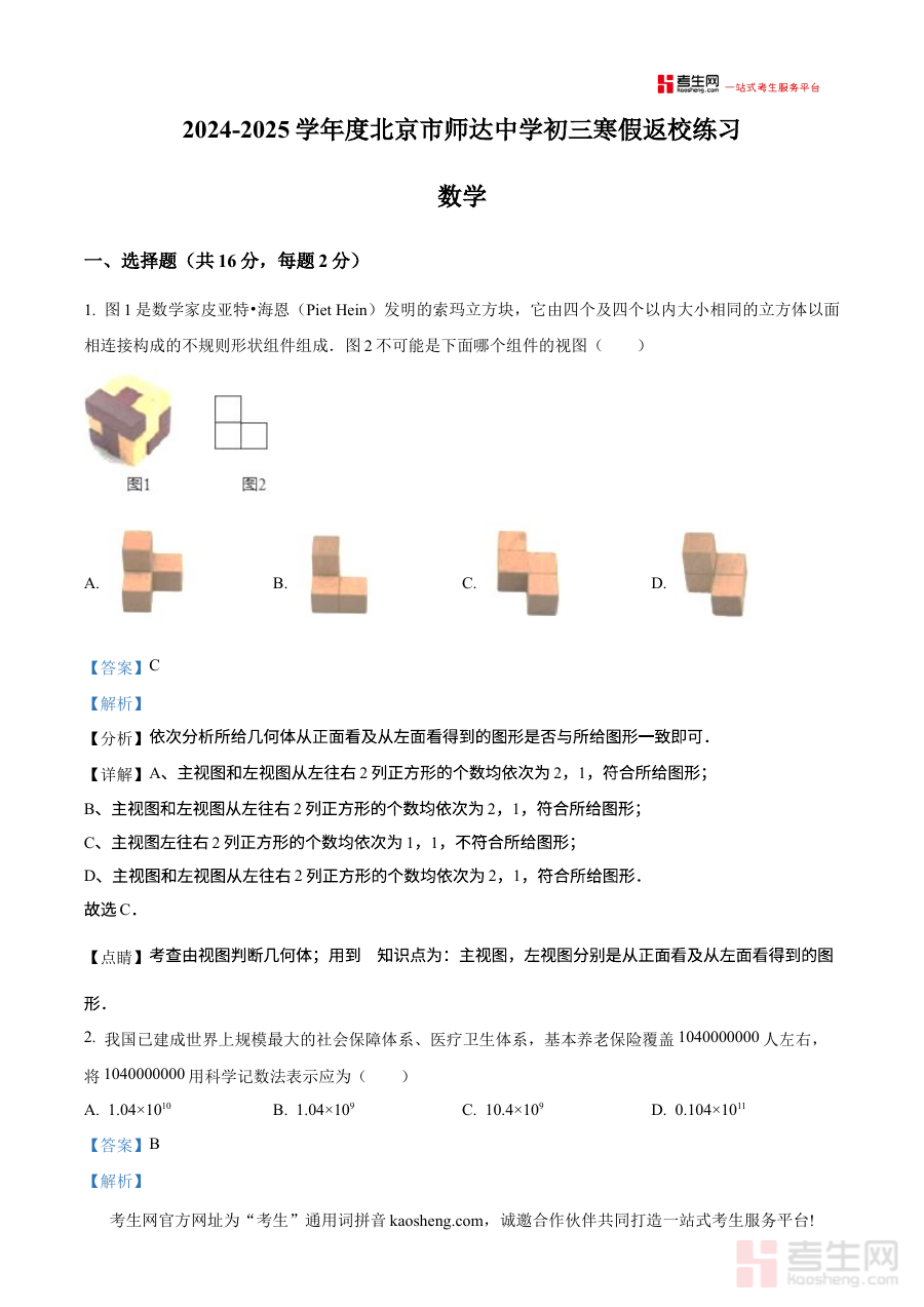 《精品解析:北京市海淀区师达中学2024~2025学年下学期九年级开学考数学试卷(解析版)》是针对北京市海淀区师达中学2024至2025学年下学期九年级开学数学考试的专业解析类备考资料。它精准匹配该学校该学年开学初期的数学检测场景,聚焦九年级学生开学阶段的数学学习情况,为使用者提供贴合学校实际考试要求的解析内容支持,帮助使用者快速对接开学考的考查方向与学校教学节奏。