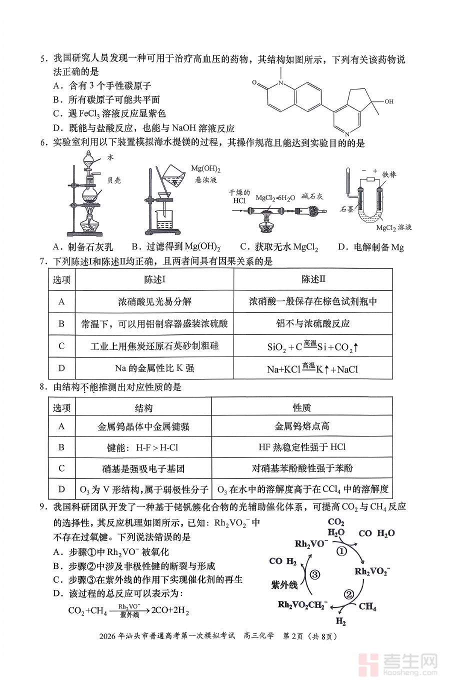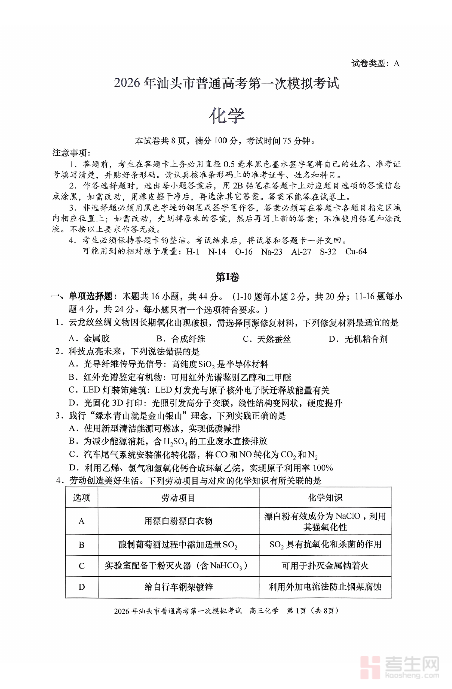 《2026年汕头市普通高考第一次模拟考试 化学+答案》是2026年度汕头市针对普通高考学生组织的第一次模拟考试化学学科资料,包含试题与对应答案两部分。作为高考备考过程中的阶段性核心资料,它依托汕头市本地高考备考规划体系,贴合当地高中化学教学实际与高考命题趋势导向,为考生搭建起与正式高考题型结构、考查方向相衔接的模拟训练载体,帮助考生提前适应高考化学考试的整体框架与要求。