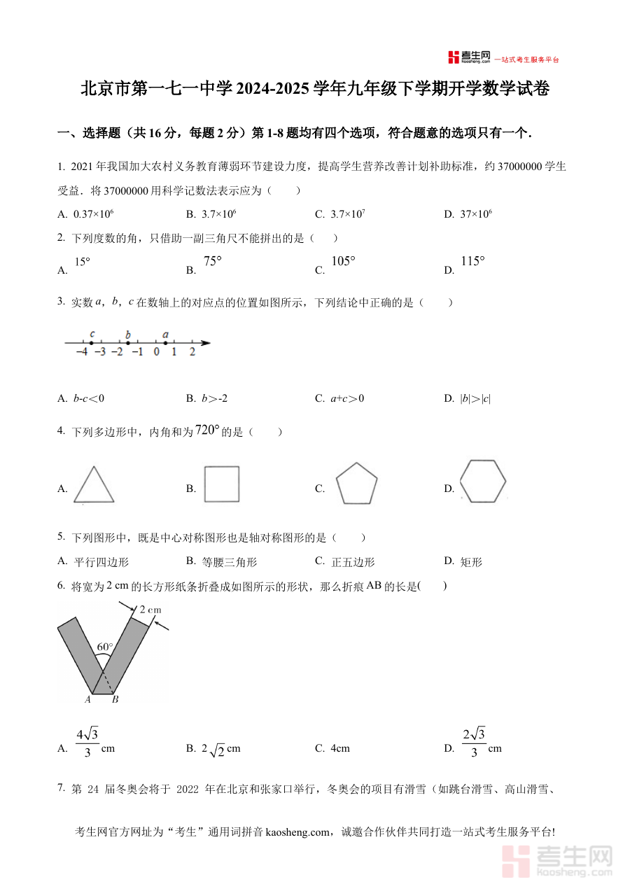 《精品解析:北京市第一七一中学2024-2025学年九年级下学期开学数学试卷(原卷版)》是针对北京市第一七一中学2024-2025学年九年级下学期开学阶段的数学学科检测资料,属于初中毕业年级开学初期的阶段性考试相关备考资源,能够反映该学校该阶段数学教学的阶段性考查方向与要求。