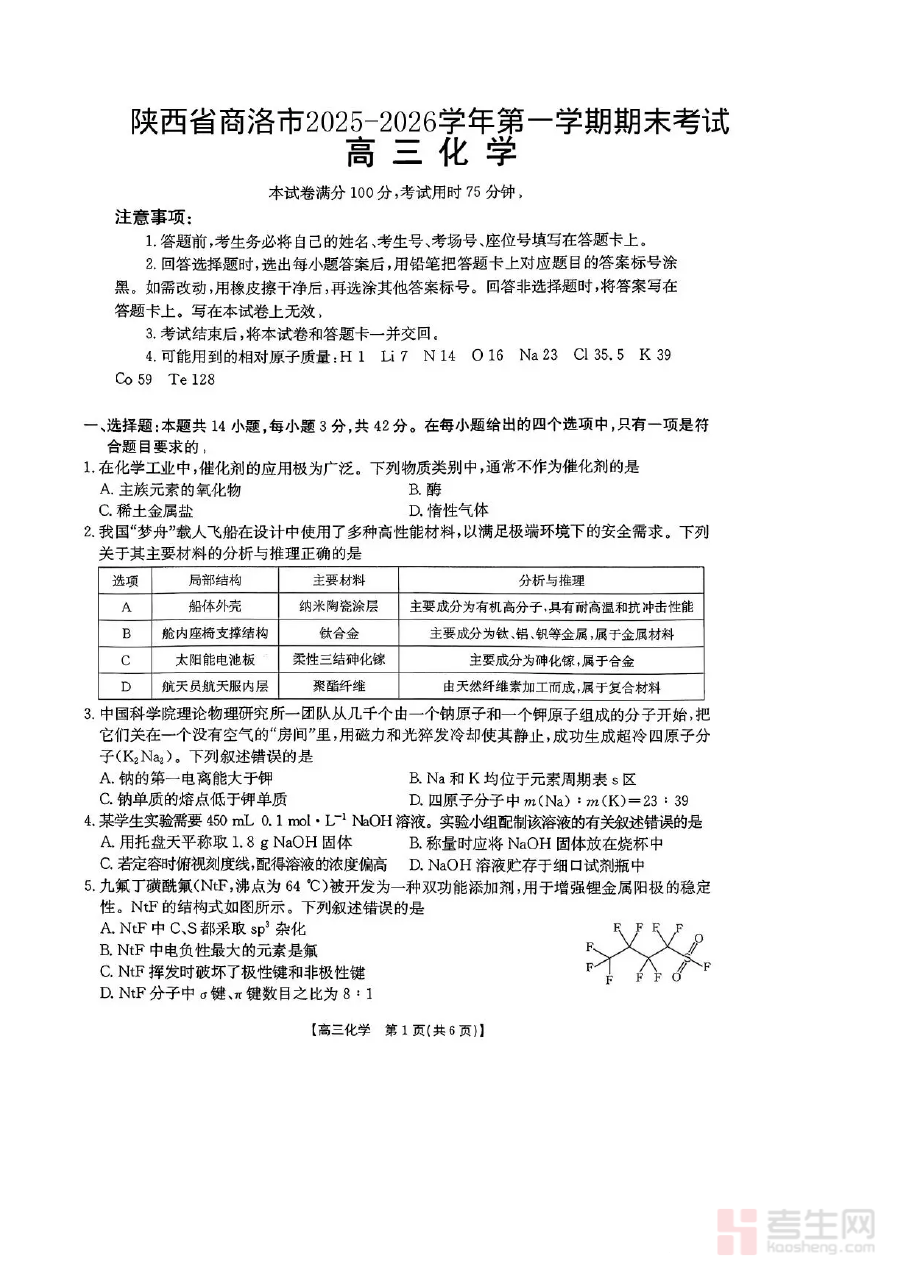 《陕西省商洛市2026届高三上学期2月期末考试化学+答案》是针对陕西省商洛市区域内2026届高三学生在第一学期2月份举行的期末考试所编制的化学科目试题及配套答案资料,属于高三阶段重要的阶段性检测备考资源。该资料紧密贴合商洛市当地高三化学教学进度与期末考命题特点,能够帮助学生提前熟悉该区域期末考的考查形式与内容方向,为学生进行针对性复习提供可靠的参考依据。