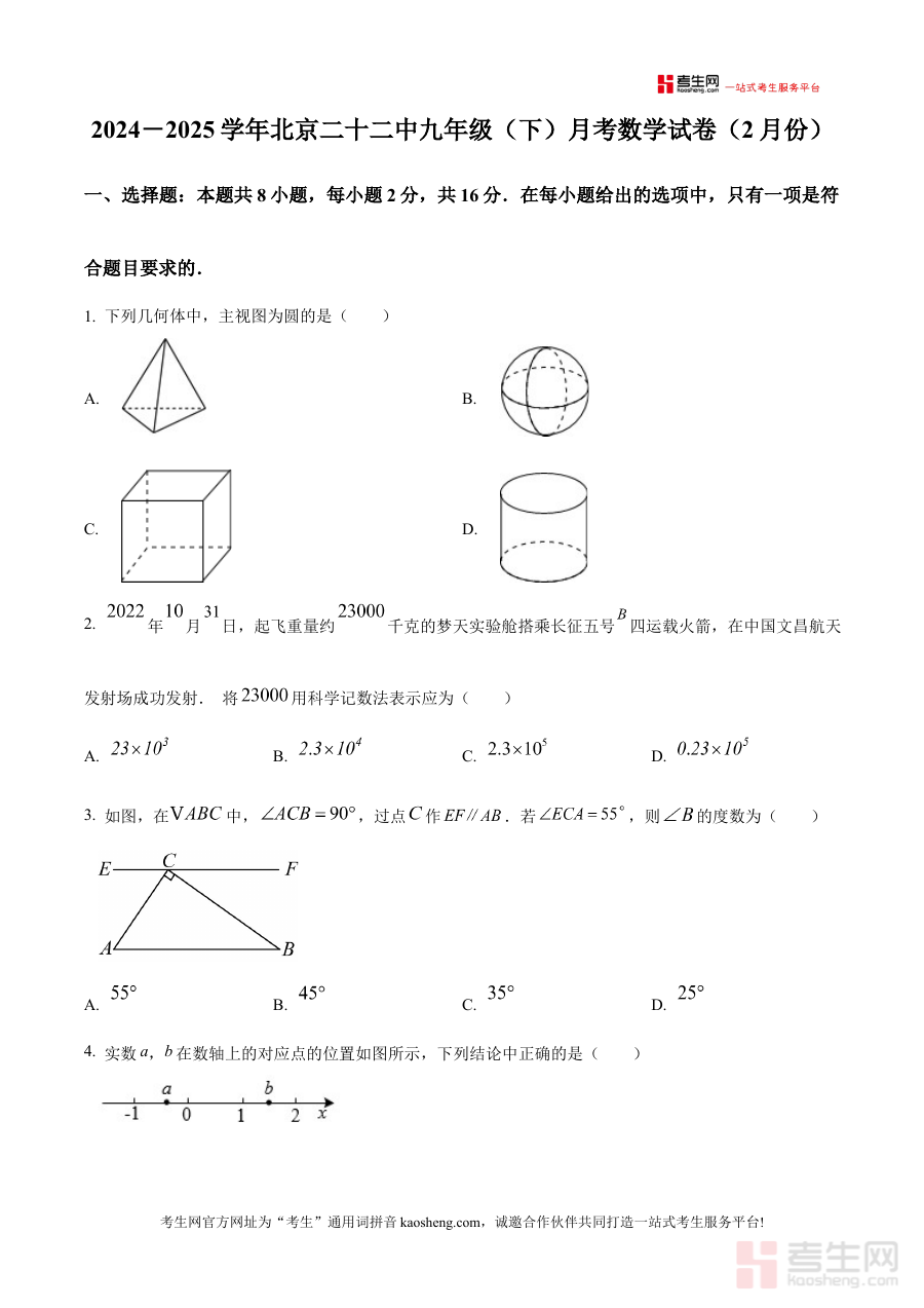 《精品解析:北京市第二十二中学2024-2025学年九年级下学期学情自测数学试卷 (2月份)(原卷版)》是北京市第二十二中学针对2024-2025学年九年级下学期学生推出的数学学情自测资料,聚焦该学年2月份的阶段性学习检测需求,为九年级学生数学学科的阶段备考提供针对性参考依据。