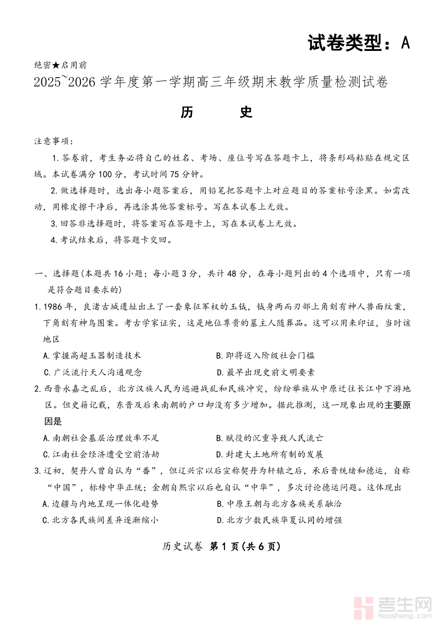 《2025—2026学年度第一学期高三年级期末教学质量检测历史》是针对该学年第一学期高三历史学科的期末教学质量检测相关备考资料,贴合高三历史本学期的教学进度与阶段学习目标,能够为师生提供与期末检测直接关联的学习与备考支持,帮助师生更好地对接期末教学质量检测的要求与方向,确保备考内容与学期教学重点及检测标准保持一致。