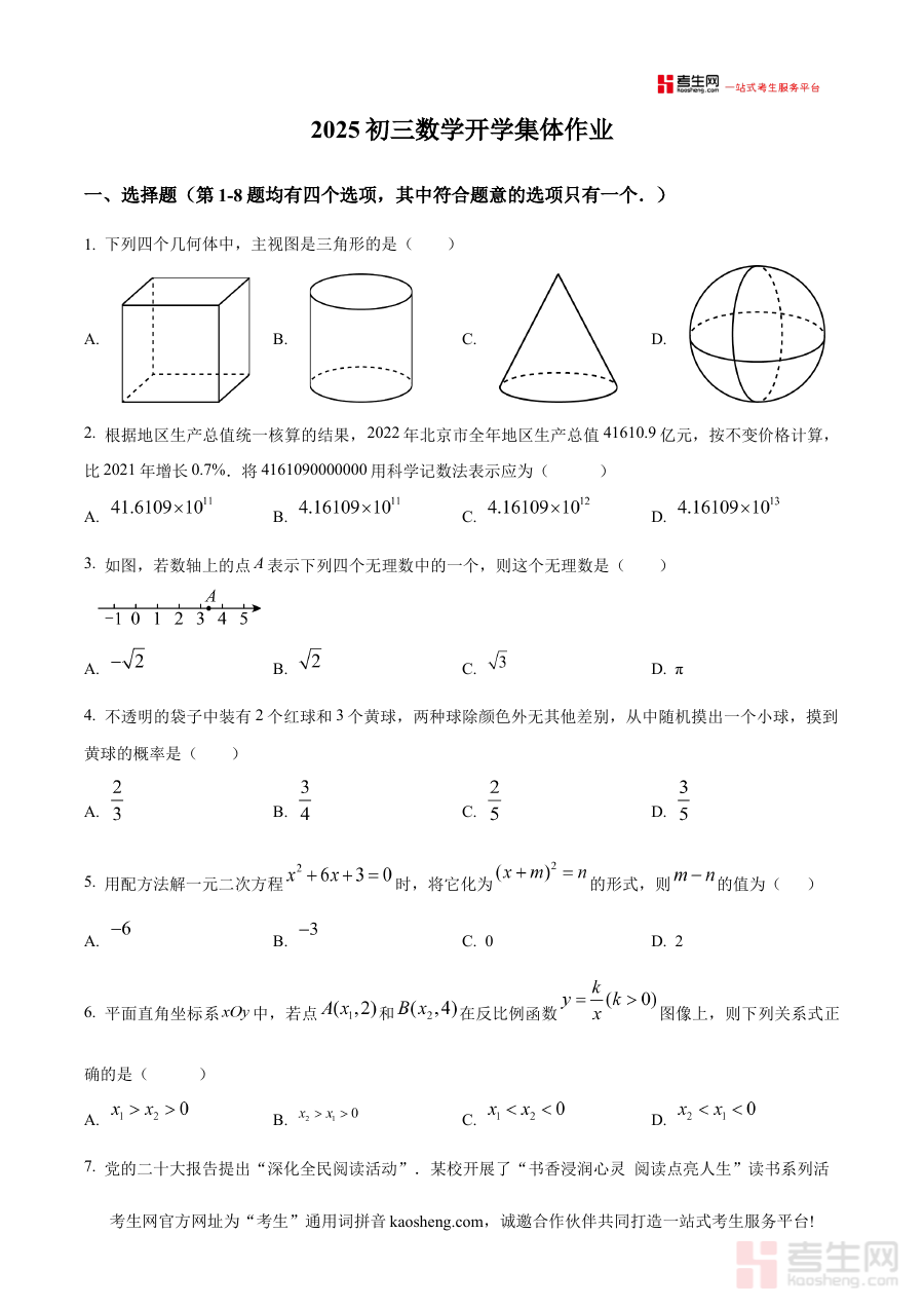该资料可用于九年级学生在开学初期开展自我学情诊断,帮助教师掌握学生假期学习效果及知识掌握程度,同时为后续数学备考规划提供数据支撑,辅助师生明确阶段学习的重点方向与提升目标。