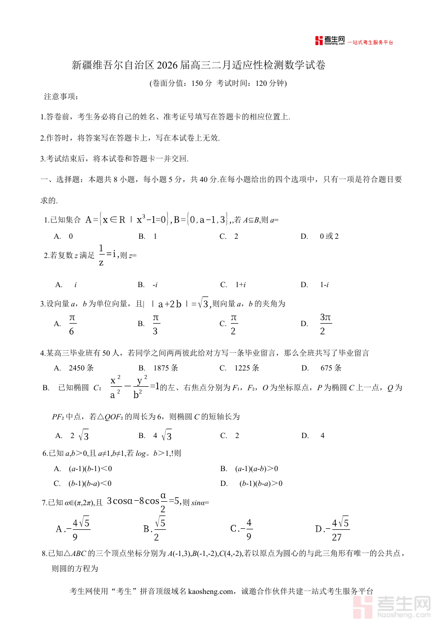 适用人群为新疆维吾尔自治区2026届高三学生及相关数学教师,对于学生而言,通过该检测可直观了解自身在阶段学习中的掌握情况,及时调整复习策略;对于教师而言,可借助检测结果优化教学计划,增强备考指导的针对性,助力师生共同提升高考数学备考效率。