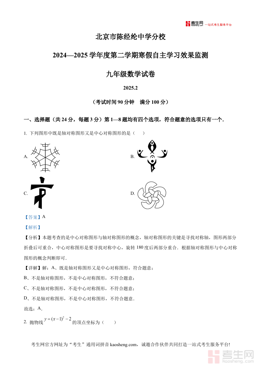 《精品解析:北京市陈经纶中学分校2024~2025学年下学期九年级数学开学考试卷(解析版)》是针对北京市陈经纶中学分校2024至2025学年下学期九年级数学开学考试的专业备考资料,聚焦该阶段学生的数学学习情况与开学考试需求,为相关使用者提供针对性的解析支持。