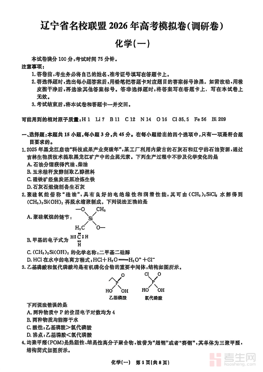 《辽宁省名校联盟2026年高考模拟卷化学一(含答案)》是针对辽宁省2026年普通高等学校招生全国统一考试化学科目的模拟备考资料,由省内名校联盟协作编制而成,包含完整试题内容及配套答案解析。该资料紧密结合辽宁省高考化学命题导向与学科核心素养考查要求,为考生提供契合本地考情的实战训练资源。