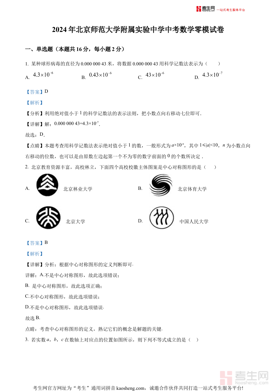 《精品解析:2024年北京师范大学附属实验中学中考零模数学试题(解析版)》是2024年北京地区针对初中毕业升学考试(中考)零模阶段推出的数学学科备考资料。该资料依托北京师范大学附属实验中学的教学资源背景,以解析版形式呈现,旨在帮助使用者精准把握中考零模数学考试的考查方向与核心要求,为中考备考初期提供具有参考价值的内容支撑。