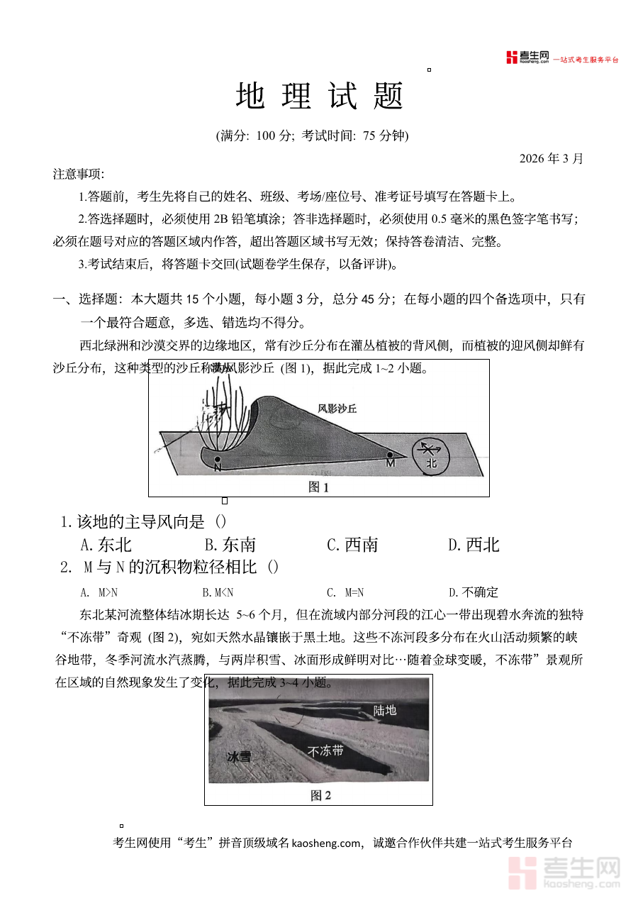 作为高三下学期关键时间节点的地理学科检测资料,该试题可用于学校对学生阶段性学习成果的精准诊断与全面评估,帮助教师有效识别学生在地理学科学习中的薄弱环节和知识盲区,同时也能让学生自身清晰认知当前的学习状态,及时调整学习策略与复习计划,为接下来的系统复习和能力提升提供科学依据。