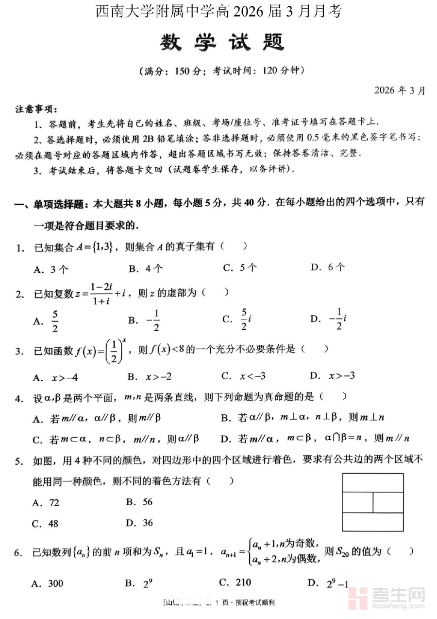 本试题的核心适用人群为重庆西南大学附属中学校2026届高三学生,同时对于其他同地区或同阶段、希望通过规范阶段性测试提升数学备考效率的高三学生也具有参考价值。它不仅是学生自我检测的工具,还能辅助教师和家长精准把握学生学习状态,为制定更科学的备考方案提供数据支持,助力学生在高考前的关键阶段稳步提升数学学科能力,为高考做好充分准备。