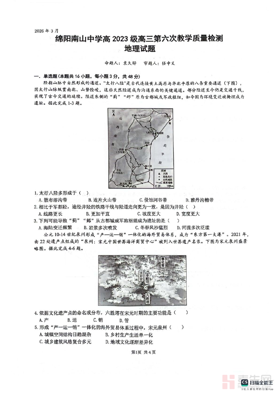《四川省绵阳南山中学2026届高三第六次教学质量检测地理试题(含答案)》是针对四川省绵阳市南山中学2026届高三学生设计的阶段性教学质量检测资料,属于高三年级地理学科的第六次教学质量评估类试题,包含完整的试题及配套答案,是该阶段地理学科教学质量检测与备考衔接的重要资料。