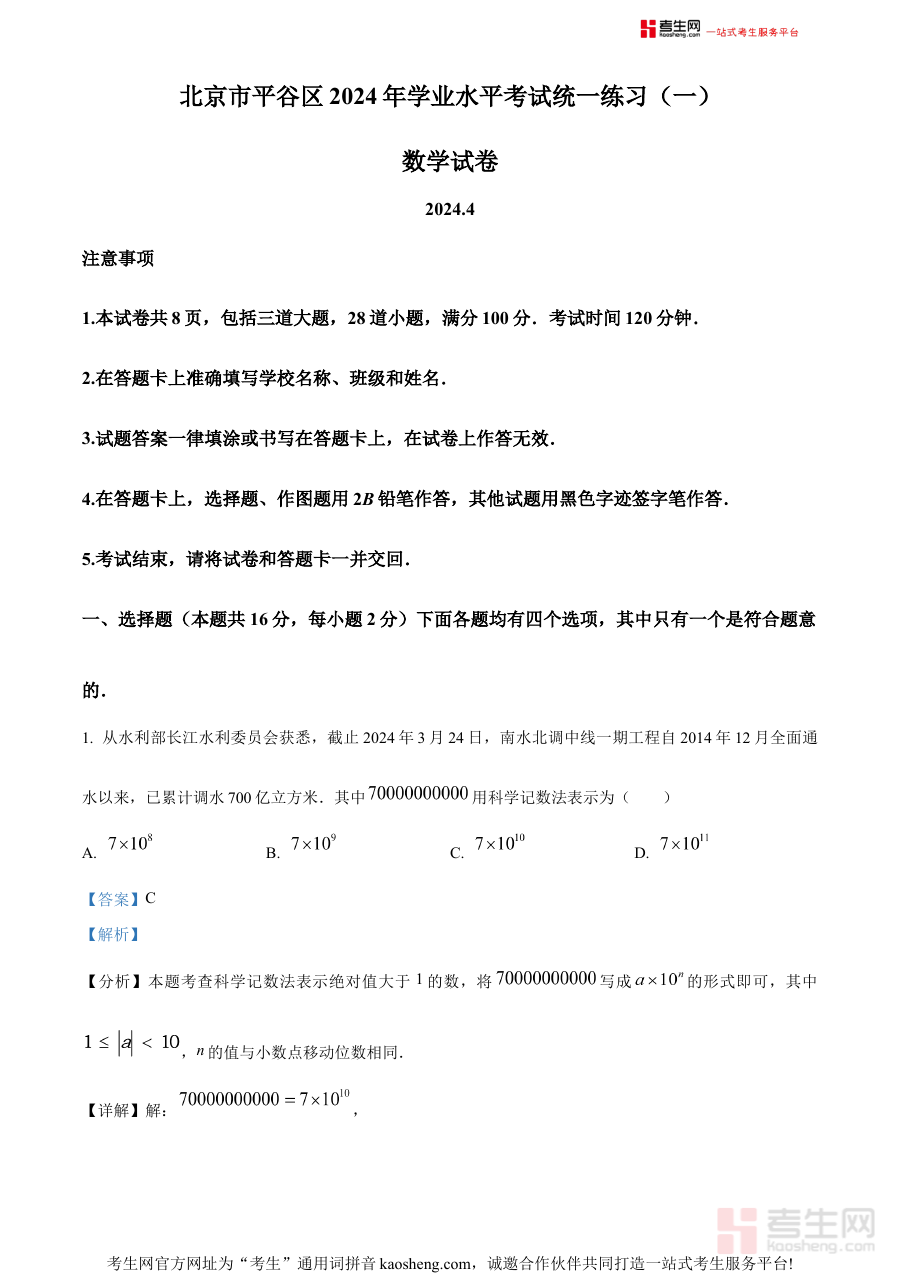 《精品解析:2024北京市平谷区中考一模数学试题(解析版)》是结合2024年北京市平谷区中考一模考试编制的数学学科备考资料,其核心定位为区域内中考前阶段性复习的辅助工具,能够反映该地区本年度中考数学复习的阶段性方向与要求,为考生提供贴合本地考情的参考依据,助力使用者把握区域命题的基本脉络与复习重点。