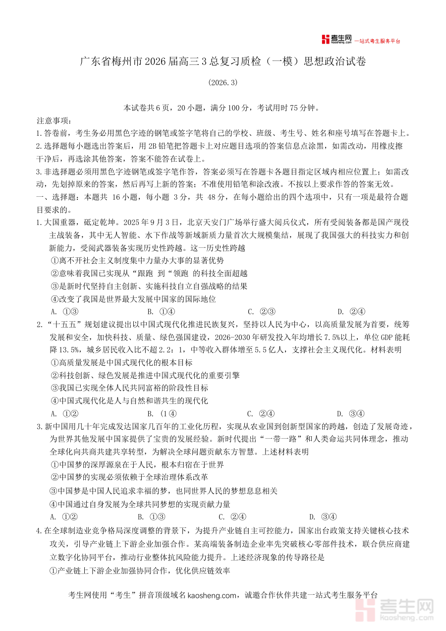 其适用人群为广东省梅州市2026届高三学生、政治学科教师及相关教学研究人员。作为一模试题,该资料能帮助学生熟悉考试流程与题型结构,提升应试技巧;同时为教师提供教学评估素材,辅助完善教学方案,共同推动高三政治学科的高效备考进程。
