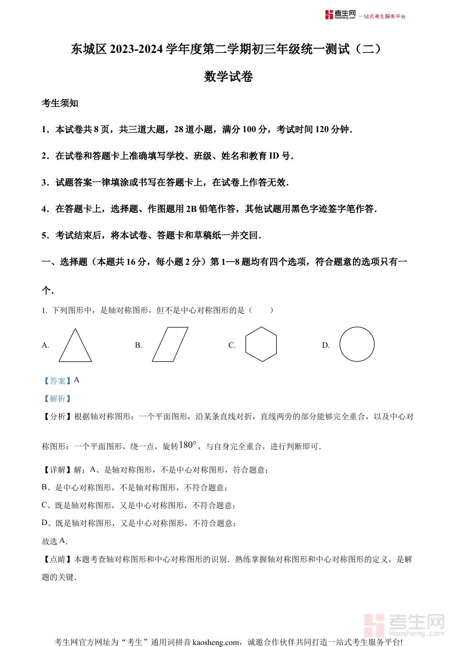 《精品解析:2024年北京市东城区中考二模数学试题(解析版)》是针对2024年北京市东城区初中毕业生中考前第二次模拟考试数学科目的专业备考资料,整合了该地区本年度中考二模数学考试的核心考查方向与命题特点,为考生及相关教育工作者提供了权威且系统的参考依据。作为中考前重要的阶段性检测资料,它精准反映了东城区中考数学备考的阶段性要求,助力使用者把握考试趋势与复习重点,为后续的针对性复习奠定基础。