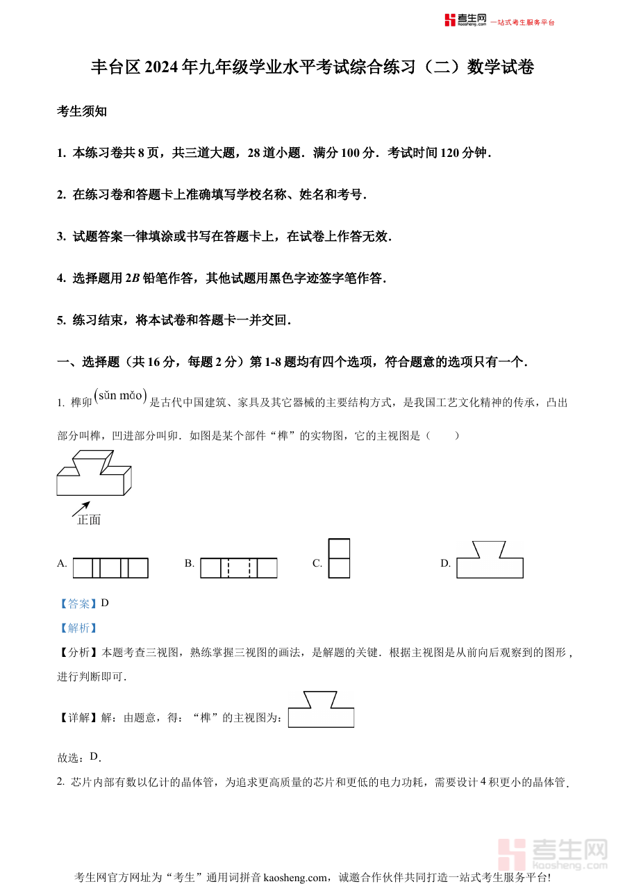 此资料主要适用于2024年北京市丰台区即将参加中考的初中毕业生,助力他们在二模考试后进行全面复盘与针对性提升;也适用于该区域的初中数学教师,为其了解学生阶段性学习状况、优化教学计划提供参考;对于中考备考指导人员而言,它能帮助把握区域二模考试的考查重点与方向,从而为考生提供更精准的备考建议,充分体现了阶段检测在中考备考中的核心价值以及科学规划对备考效果的促进作用。